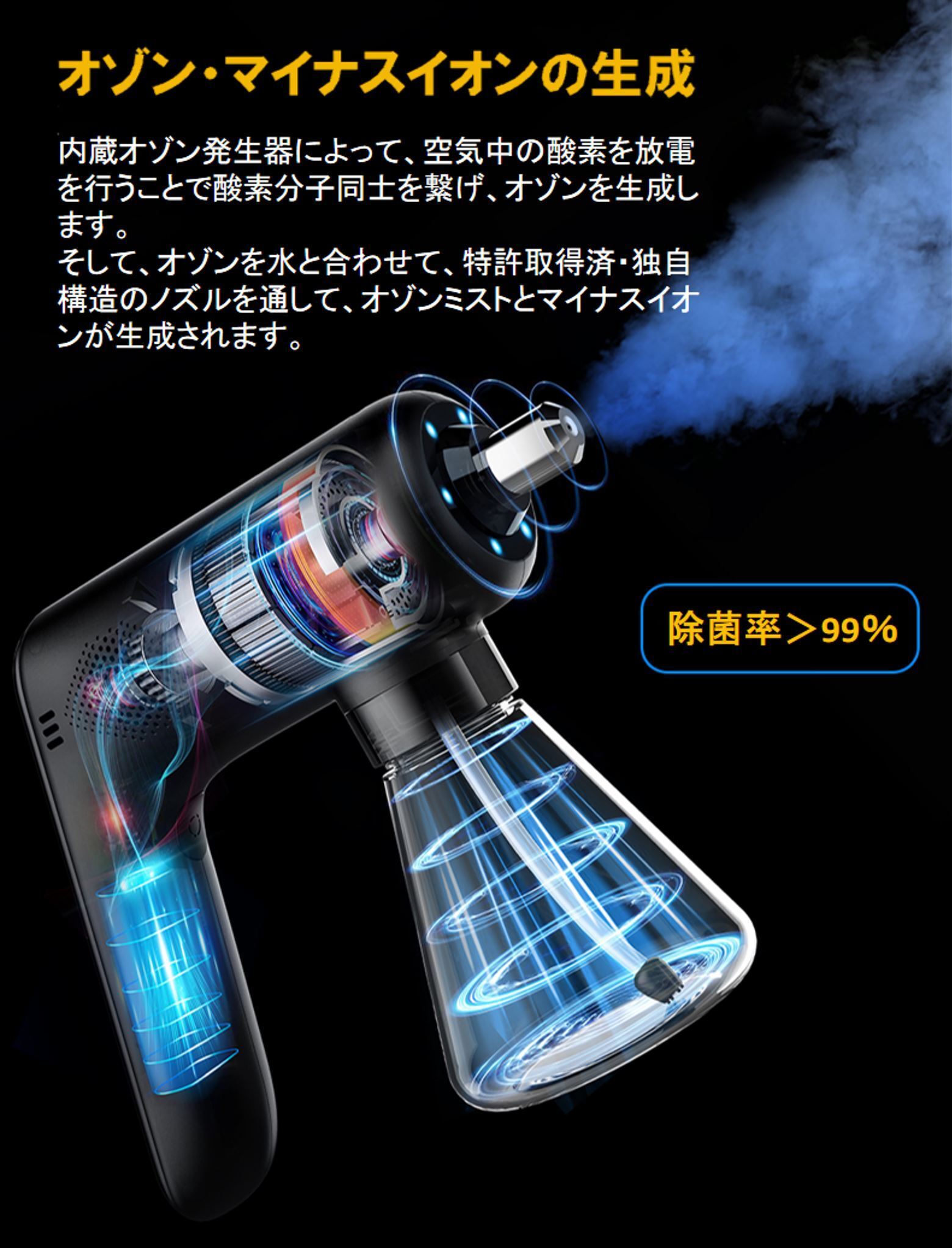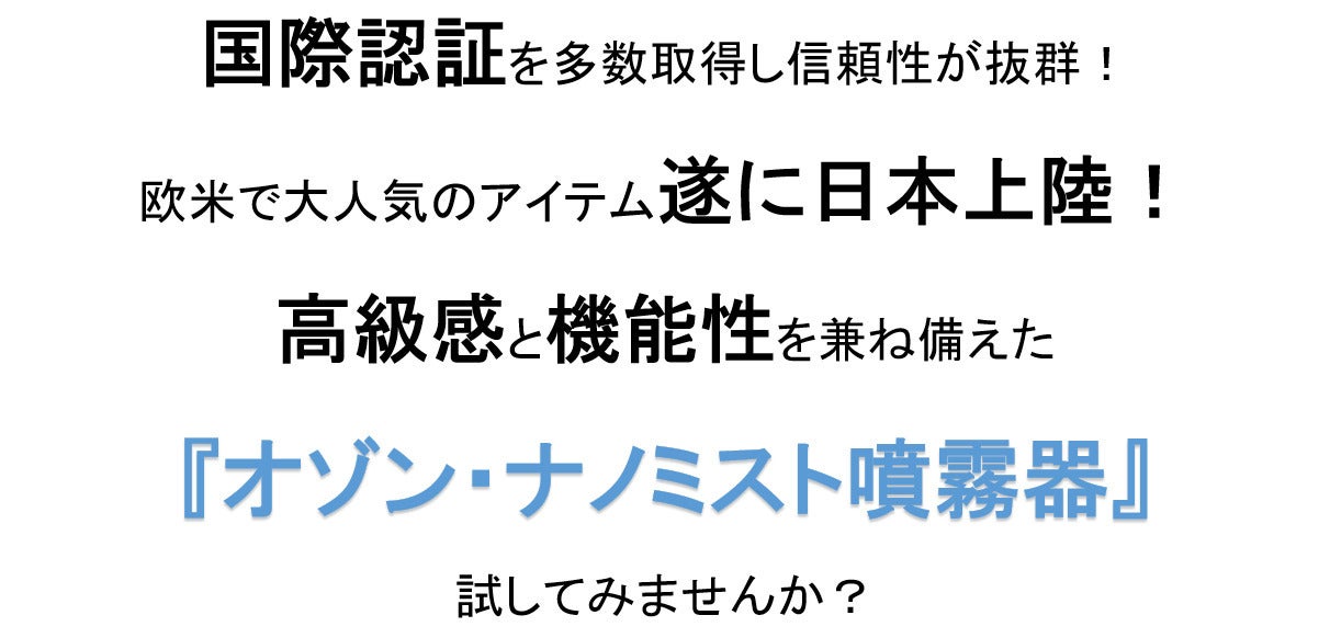 そこで、今回、家庭や施設の備品としておすすめの衛生対策グッズ、品質の高い「オゾン・ナノミスト噴霧器」について皆さんにご紹介させていただきたい次第です。「オゾン・ナノミスト噴霧器」は、簡単にオゾンが生成され、水と同時に使う際にナノレベルのオゾンミストを噴霧することができます。オゾンミストにより、手軽に身の回りを除菌し、清潔に保ちます。拭き取りも不要ですごく便利なアイテムです。