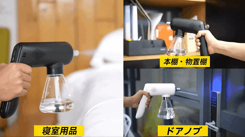 毎日利用している寝室用品、本棚・物置棚、およびドアノブなど手軽に除菌。