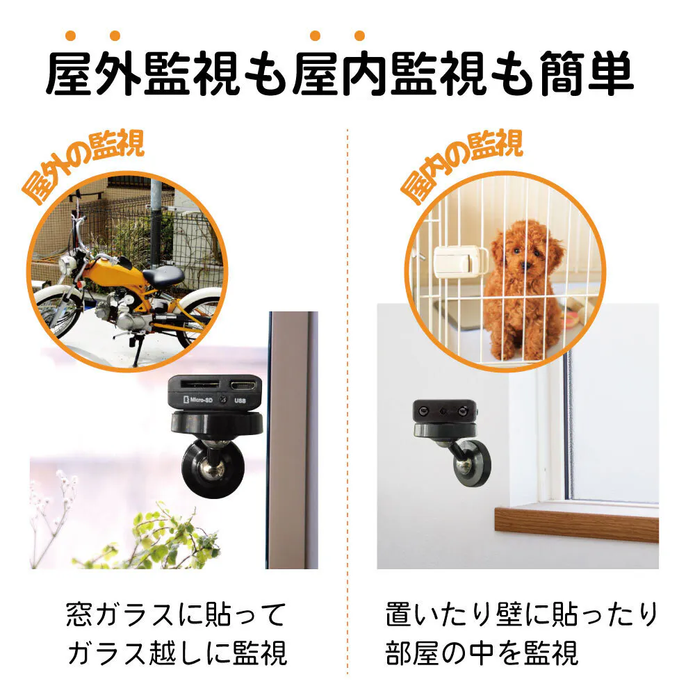 窓ガラスに貼って、壁に貼って、机に置いて、超小型軽量で取付角度調整可能なカメラだからできる芸当です。