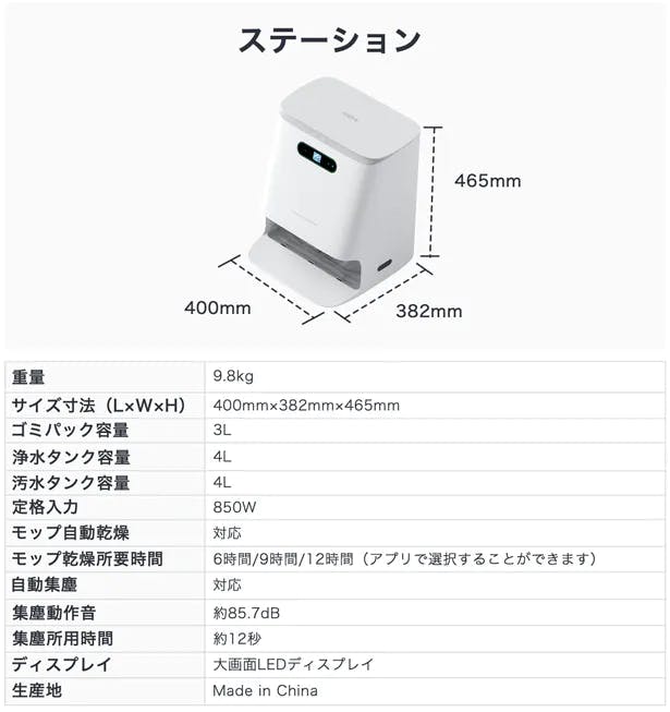 掃除終了後、自動でステーションに戻り、浄水タンクからキレイな水を流しながら、モップを高速回転することで、洗濯板で擦り付けるようにモップをキレイに洗浄してくれます。