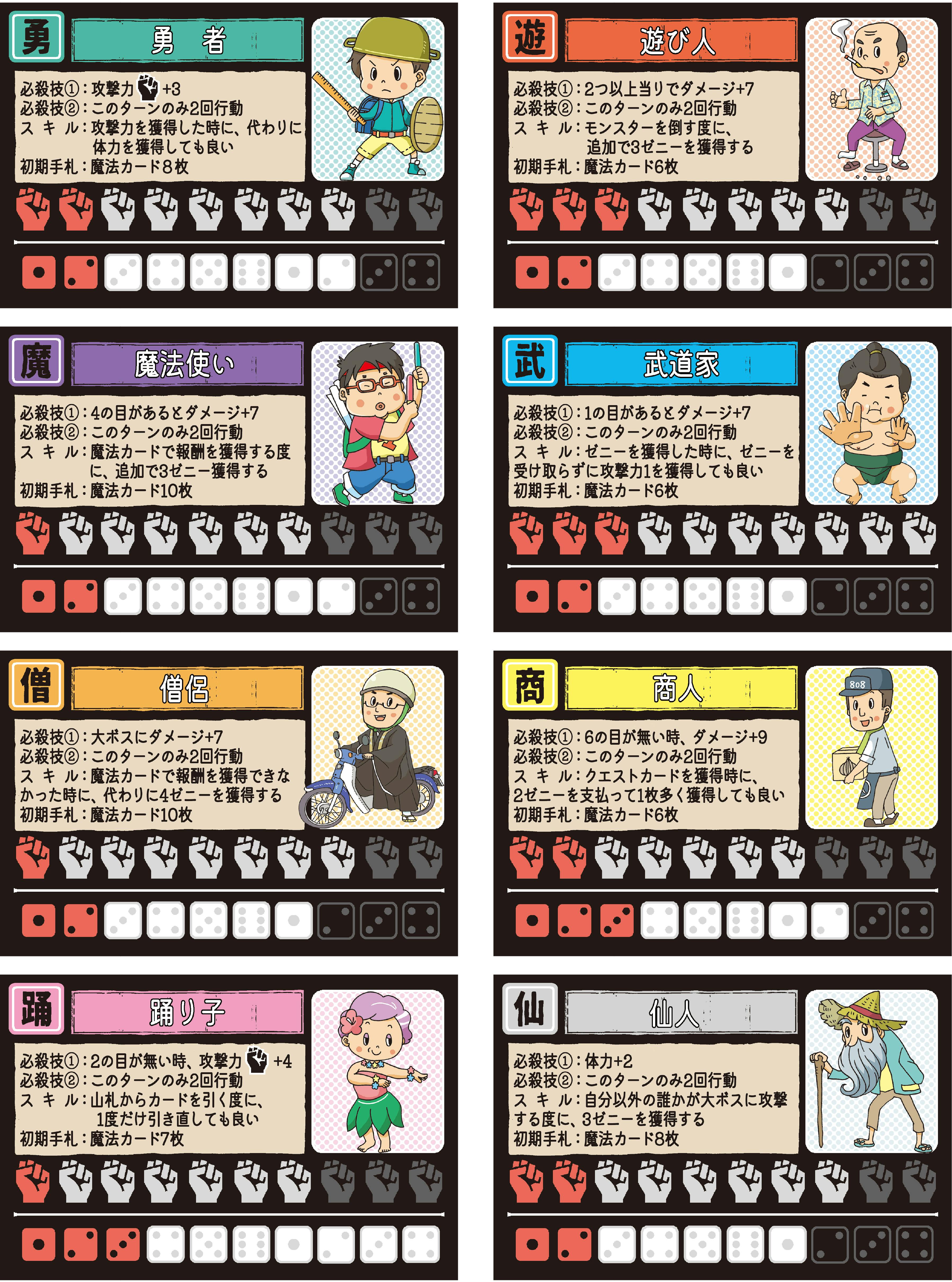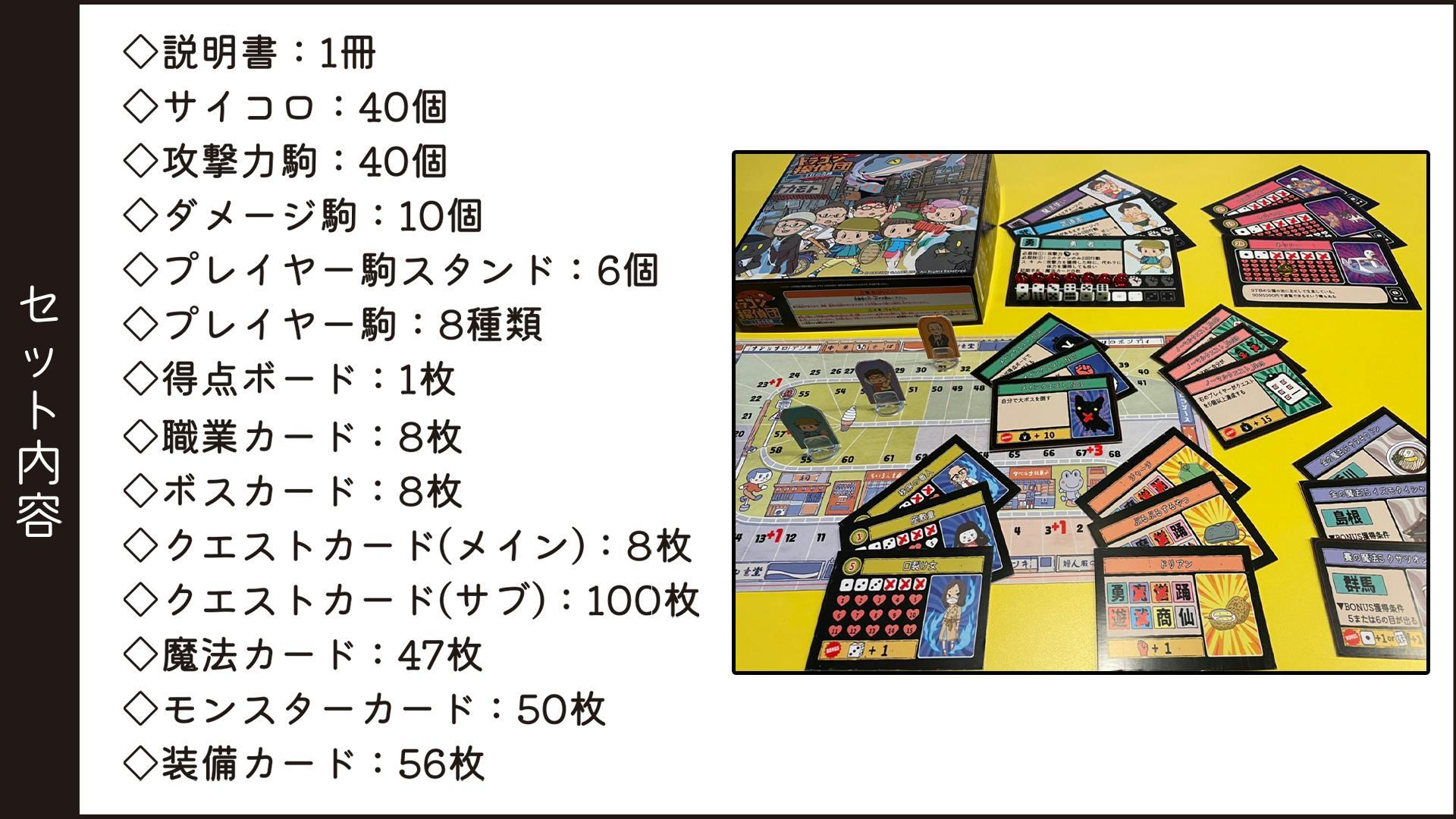 ●付属される特典カードについて特典カード(職業カード/ボスカード)は、いずれも通常版のカードとはデザインや各種パラメータ等の性能が異なるカードとなっていて、任意の枚数だけ通常版のカードと入れ替えてプレイする事で、通常版とはまた違った感覚でゲームをお楽しみ頂く事ができます。