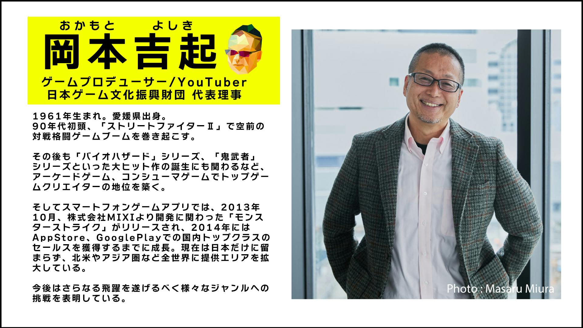 本プロジェクトをご覧頂き、ありがとうございます。ゲームプロデューサー兼YouTuberの岡本吉起です。