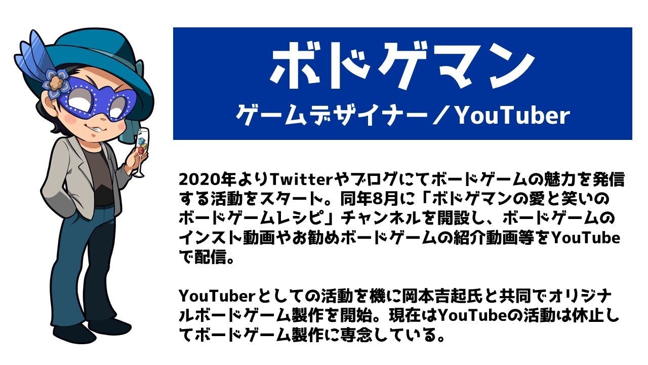 そして、岡本吉起のボードゲーム制作を丁寧にサポートしてくれるYouTuber『ボドゲマン』と一緒に第2弾、第3弾と制作を続けてまいります、今後の展開にもぜひご期待ください♪