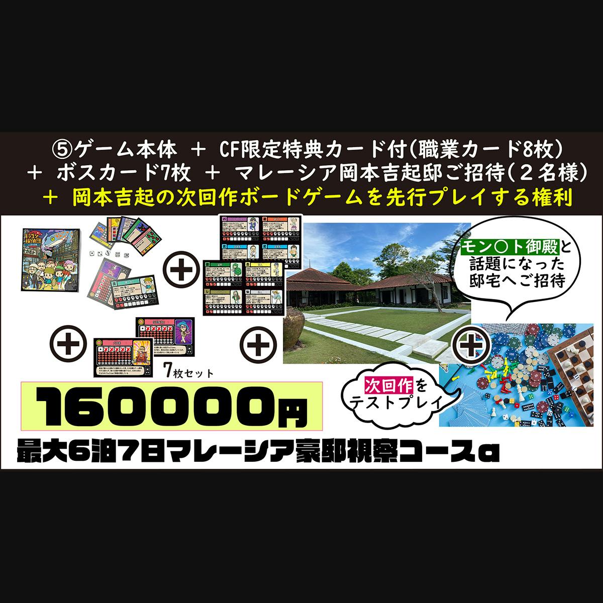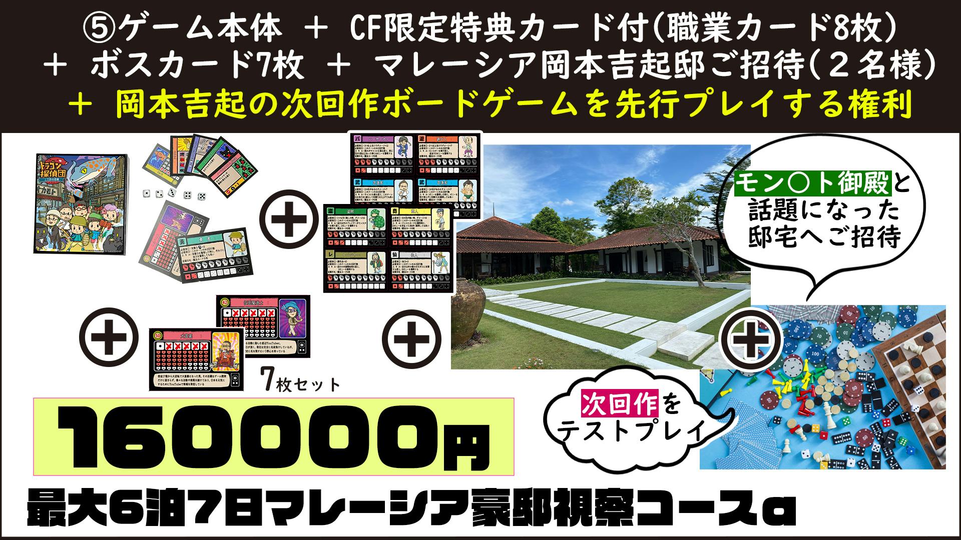 2023/03/10 15:52皆様、本プロジェクトにご支援くださり本当にありがとうございます!クラウドファンディング終了まであと9日!支援者様からのご要望もあり、新たなリターン品を3つ追加致しました!注意事項をご確認の上、この機会にぜひご支援ください♪追加リターン①【現地集合/現地解散】最大6泊7日マレーシア豪邸視察&先行プレイ会コース 160,000円リターン内容:『ドラゴン探偵団』本体+キャンプファイヤー支援者様限定『ドラゴン探偵団』特典カード(職業カード8枚)+高額支援者様限定『ドラゴン探偵団』特典カード(ボスカード7枚)+【2名様分】マレーシアの岡本邸宿泊(最大6泊7日)ご招待券 ※1日3回食事、社用車、国際タクシー等でお出迎え付+未発表のボードゲームを先行してプレイできる権利 ●リターンに関する概要と注意事項マレーシア・ジョホール州に住む岡本吉起の邸宅に最大6泊お泊り頂けます。マレーシア・ジョホール州の岡本宅にて現地集合、現地解散となります。シンガポール・チャンギ空港着の場合は社用車でお迎えも可能です。岡本宅までの交通費、滞在に伴う諸経費は支援者様のご負担でお願い致します。岡本のメイドたち(スリランカ人) が作る、エスニックなお食事を1日3回ご用意します。ご希望でしたら岡本の愛車「メルセデスベンツ・マイバッハ」「Jeep Wrangler」などにも試乗頂けます。滞在中は『ドラゴン探偵団』のプレイ会はもちろん、未発表のボードゲームの先行プレイや『カタン』などの名作ボードゲームもご一緒にプレイしましょう。宿泊コースは2023年の9月以降に実施予定で、先着順で宿泊可能な期間をご案内させて頂きます。ご滞在期間は支援者様のご希望に岡本ができる限り合わせます。追加リターン②2大都市開催! 未発表のボードゲームの先行プレイ会コース 60,000円(税込)リターン内容:『ドラゴン探偵団』本体+キャンプファイヤー支援者様限定『ドラゴン探偵団』特典カード(職業カード8枚)+高額支援者様限定『ドラゴン探偵団』特典カード(ボスカード7枚)+【東京都内、大阪府内開催】岡本吉起と未発表のボードゲームを先行プレイする(2時間)●リターンに関する概要と注意事項開催場所(東京都内もしくは大阪府内)にて、岡本吉起、支援者様、ボードゲームスタッフと一緒に未発表のボードゲームを楽しむ会になります。プレイするゲームはプロトタイプのボードゲームや、『カタン』を予定しております。初めてプレイされる方がいらっしゃった場合は、皆様が楽しく遊べるよう岡本が解説をいたします。支援者様と開催日の日程調整を行ったのち、開催場所(東京都内もしくは大阪府内)をご相談させて頂きます。開催は2023年の8月もしくは10月を予定しております。開催場所にて現地集合、現地解散となります。会場までの交通費、滞在に伴う諸経費は支援者様のご負担でお願い致します。追加リターン③東京西麻布開催!岡本吉起と一緒に日本料亭でディナー&未発表のボードゲームの先行プレイ会コース 90,000円(税込)リターン内容:『ドラゴン探偵団』本体+キャンプファイヤー支援者様限定『ドラゴン探偵団』特典カード(職業カード8枚)+高額支援者様限定『ドラゴン探偵団』特典カード(ボスカード7枚)+【東京西麻布開催】岡本吉起と一緒にディナー&未発表のボードゲームを先行プレイする(3時間)●リターンに関する概要と注意事項開催場所(西麻布)にて、岡本吉起と日本料亭でのディナーをお楽しみいただいた後、支援者様、ボードゲームスタッフと一緒に未発表のボードゲームを楽しむ会になります。プレイするゲームはプロトタイプのボードゲームや、『カタン』を予定しております。初めてプレイされる方がいらっしゃった場合は、皆様が楽しく遊べるよう岡本が解説をいたします。支援者様と開催日の日程調整を後ほどご相談させて頂きます。開催は2023年の8月もしくは10月を予定しております。開催場所にて現地集合、現地解散となります。会場までの交通費、滞在に伴う諸経費は支援者様のご負担でお願い致します。 もっと見る