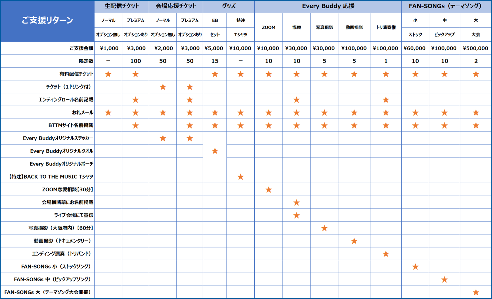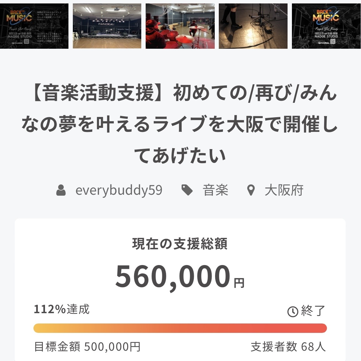 2023/03/25 04:17【ありがとうございました】目標金額:500,000円支援総額:560,000円支援者数:68人目標達成率:112%まず、ご支援いただいた方々には心から御礼を申し上げます。初めてのクラファンはなかなか上手くいかないときいていたのですが、皆さんの暖かいお気持ちのおかげで目標を大きく上回る結果となり、もう何と御礼を言えばいいのか!できることなら一人一人訪ねて行ってハグでもしたいくらいです。本当にありがとうございました!【3/25 Back to the Music】いよいよ本日となりました。*もし、急遽会場入場希望の方は直接2F受付にいらしていただければ対応いたします(入場料2,000円)2021年6月のコロナ延期の後、11月にスタートし、ほぼ毎月開催してきました出演者公募型ライブイベント『Back to the Music』(以下BTTM)発表の場が減っている音楽活動を趣味としている方々のために、少しでも活躍の場を!そしてみんながそれぞれの大切で特別な音楽に戻ろう!というコンセプトで開催してきました。Back to the Music とはご存じかと思いますが、最近はようやく街で開催されるイベントも増えてきて音楽活動される方々の勢力的なライブ姿もよく見られるように感じています。そんな中当初のBTTMの目的は、一旦ここで終了でいいのかなと思いまして。今回は集大成の意味を込めて「初めて・再開・マッチング」に限定した出演者の募集としました。勇気を持って初めてのライブに挑戦された方。何十年ぶりという久しぶりのライブに昔の仲間と挑戦される人生の大先輩の方。バンドでやってみたい夢を叶えようと応募してくれた方。そしてそういう方々を助けてあげようと立ち上がってくれた現役のサポート陣の方々。またこのコンセプトに共感いただきクラファンで多大な支援をくださったみなさん。今までのBTTMがそうであったように、今回も私たちだけでは決して成し遂げることができないこと。みなさんに支えられているからこそのことだと、改めて実感しています。朝早いのにこんな時間まで綴っているのが感動の証拠と思ってください(現在午前4時。笑)本当に、みなさんには感謝しかございません。以下、支援くださった一部(リターンにお名前掲載含む)の方々を紹介させてください。【ご支援者さま(敬称略)】イーストブック/koji0731t/なかやま たかし/仮フラワー/ながやん/佐藤 貴俊/伊東 真理/佐藤 晃一/玉川 千陽/三品 正洋/伊藤 健/岡田 和也/志岐 遼介/松本 直人/めだか家・和(和み)/すぎほちはや/M6/たかいえ!/mie-mie/ぼりびぃ/マキシマス/フォト検2級君/柿平 順子/平 健介/福原 栄二/奥村 雅一/冨重 真帆/大井 雅也/有田 須美江/石塚 大二郎/西嶋 雅己/吉本 純一/弥園 秀和/野村 美雪/岡崎 ゆい/松田 光司/大橋 千賀子/越智 勝寛/Pocketny Gladiolus/西川 孝彦/髙野 敏彦/田中 稔久/KENZO/m.minami/東尾 佳昭【協賛ご支援】◆タビオ株式会社 https://tabio.com/jp/corporate/◆株式会社Kips http://www.independents.jp/ https://mercymercy-music.com/◆THE GORO BAND https://www.facebook.com/goroband.gmwその他、生配信チケットご購入の方はもちろん、ご支援いただいた方全てに当日の生配信限定URLをクラファンご登録のアドレスにメールにてお送りしていますので、どうぞご確認ください。念のため、後ほど再度お送りいたします。後日アーカイブでもご覧いただけるようにいたしますが、出演者のみんなを応援するお気持ちで、ぜひリアルタイムで観覧いただけると幸いです。本日はみなさんにお目にかかることができるのを楽しみにしています。改めまして、ありがとうございました。株式会社Every Buddy代表 松本 恵 もっと見る