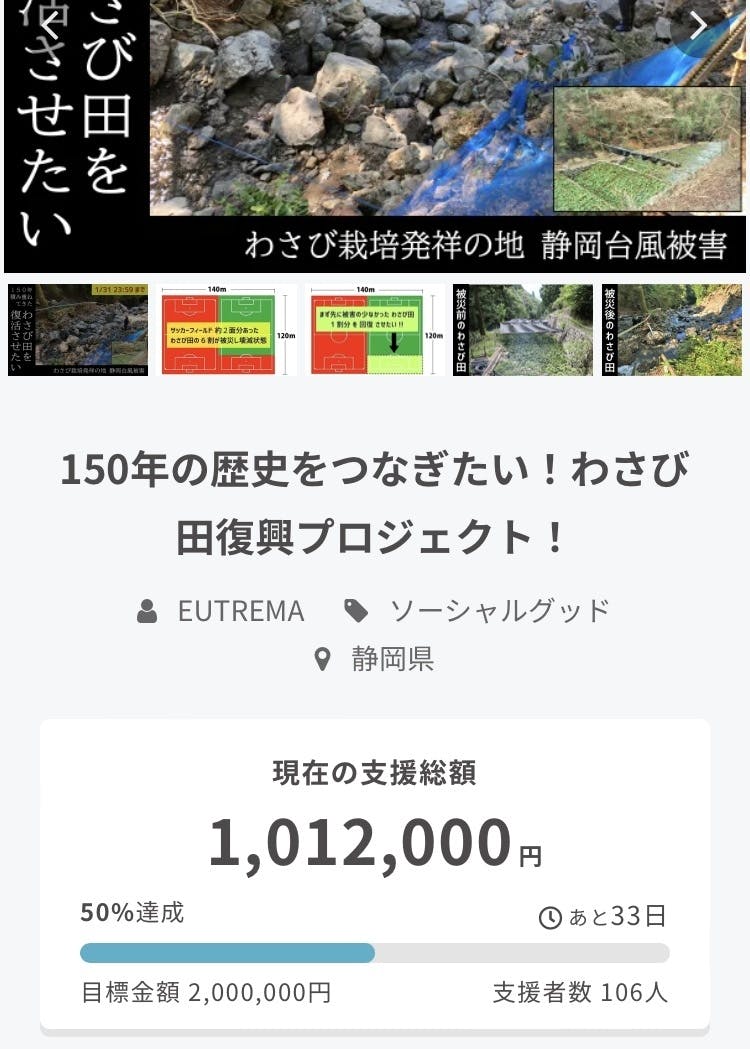 2022/12/29 12:13目標50%超えました、ありがとうございます!みなさま、ご支援、情報の拡散などご協力いただきありがとうございます。おかげさまで、100名以上の方にご支援賜りまして、年内に目標額の50%を超えることができています。温かいご支援、コメント本当にありがとうございます。復興作業については、年末年始が繁忙期のためなかなか取り組む時間がありませんが、年明けから少しずつ修繕の準備をしていく予定です。引き続き、1月末まではこのクラウドファンディングを続けていきます。また、この静岡の台風被災地域の情報や、本わさびの魅力を多くの方に知っていただきたく尽力します!引き続き、ご支援、情報の拡散などご協力いだたければ嬉しいです。【SBSテレビ 静岡わさび台風被災地の現状】https://youtu.be/Xx3nQuZfNQU もっと見る