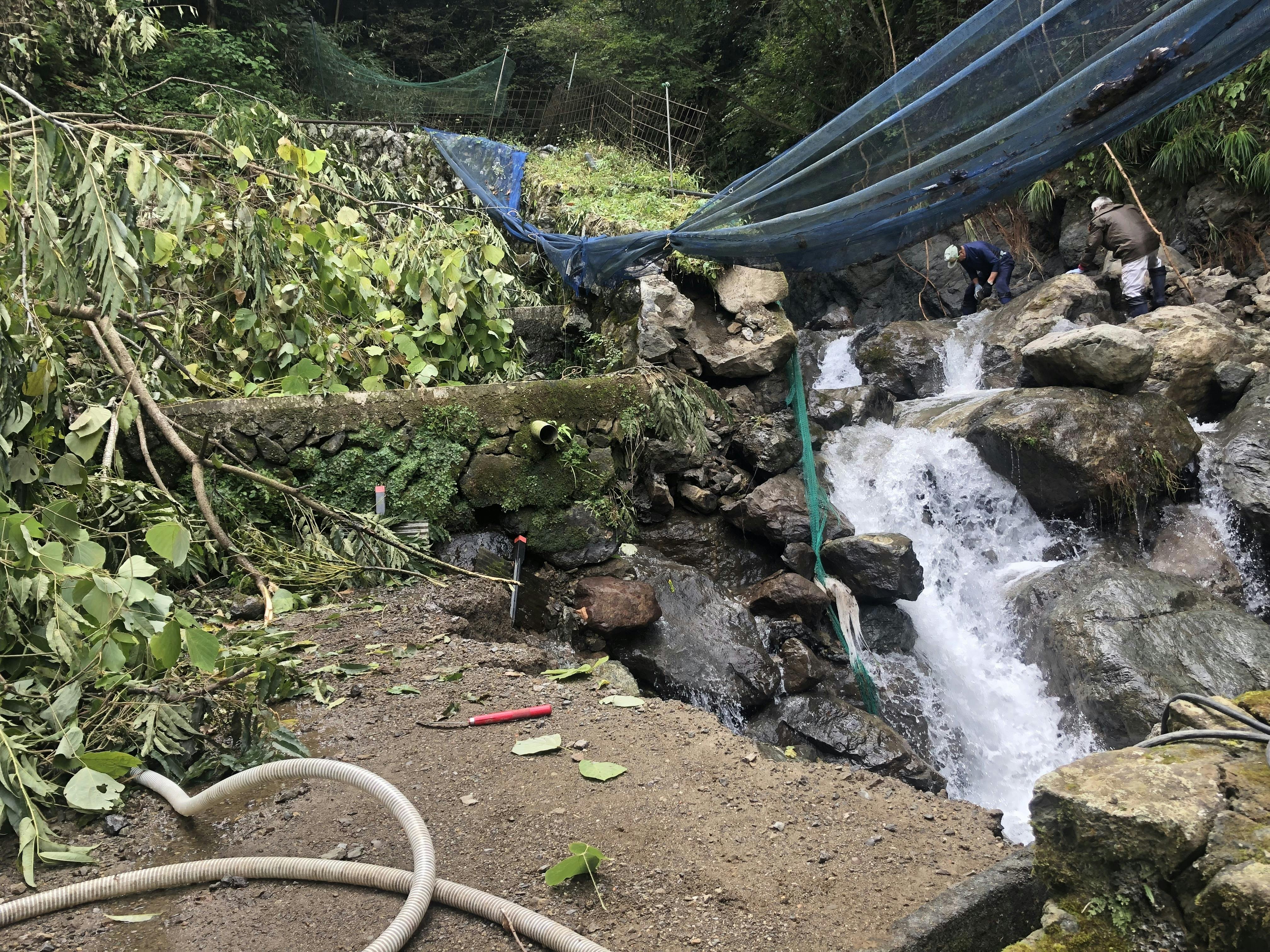 現在は無事だったわさび田の収穫・栽培をしながら、同時並行して被災箇所を自助的に修復している状況です。