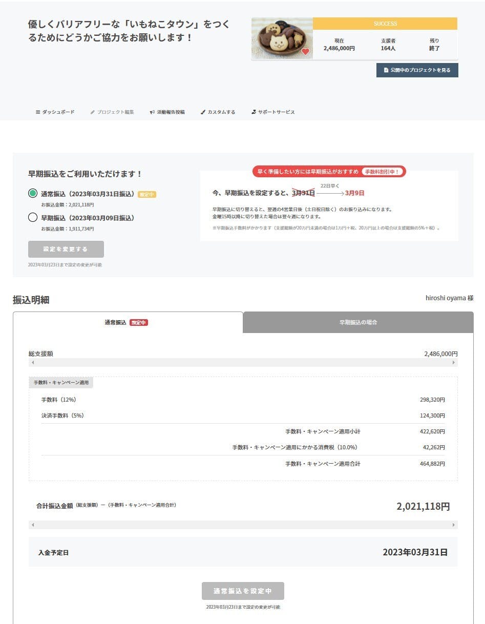 2023/03/01 14:59おかげさまで、昨日、無事クラウドファンディングが終わりました!寄せられた金額は、¥2,486,000。運営サイトへの手数料(¥422,620)と消費税(¥42,262)を差し引いても¥2,021,118さらに直接のご支援¥423,000を加えれば合計 ¥2,444,118もの額になります。ありがたく有効に使わせていただきます!!そしてさらに嬉しかったのは、皆さまからの励ましのメッセージです。いもねこのみんな、ドリーム・フィールドのみんなにとってもとても心強く背中を押していただいていることを実感することでしょう。しかし!!移転はいろいろな面で遅れてしまっています。工事そのものよりも、手続き関係が一番大変でした。福祉課への移転、新設届はもちろん、各方面への手続き、特に建築行政課、消防署などへの図面関係、申請書類などの不備など差し戻しやチェック待ちなどによって遅々として進まず、やっと出口が見えてきたところです。もちろん工事は少しずつ進めていますが、当初よりも全体として1ヶ月ほど遅れてしまっています。したがって、オープンは4月上旬、リターン品の発送は順次ということになってしまいます。本当に申し訳ありません!!しかも160人以上という、想定以上にたくさん集まった支援者の皆さんへの返礼品の数に工房のみんなも嬉しい悲鳴を上げています(*^-^*)早い方でも4月上旬、遅い方で5月くらいになってしまうかもしれません。踏み倒すことはありませんので(笑)どうか気長にお待ちください!!!そして、いもねこタウンは必ず完成させます~!!(*'ω'*)オープンに伴う動きは、また追ってご案内させていただきます。また工事終了後 、3月31日のクラウドファンディング総額の振り込みの後での各方面への支払い終了後には会計報告もさせていただきますので、今しばらくお待ちください!!本当にありがとうございました!!そして、いもねこタウン心待ちになさっていてください~!! もっと見る