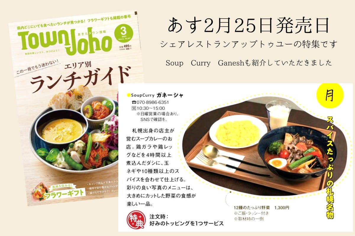 2023/02/24 13:24いよいよ残すところ4日になりました。ご支援いただいた皆様ありがとうございます。ラストスパートに向けて頑張ります。さて、先日取材していただいた『あきたタウン情報3月号』があす、2月25日発売です。シェアレストランアップトゥユーさんの特集で、スープカレーガネーシャも紹介していただいています。手にする機会があればぜひご覧ください。それでは、残り4日よろしくお願い致します。 もっと見る