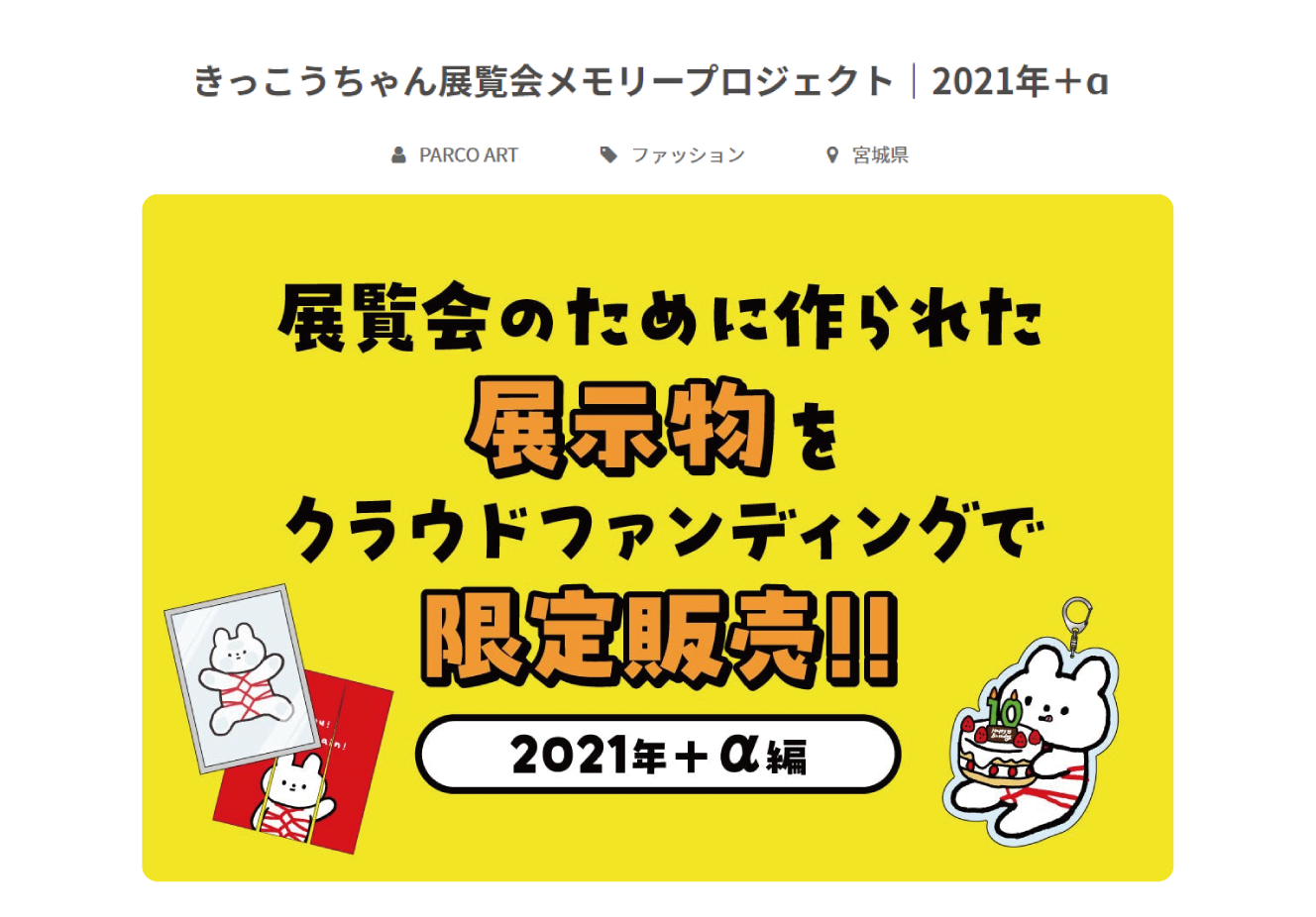 2021年に開催された仙台発のキャラクター「きっこうちゃん」の10周年をお祝いするメモリアル展覧会。会場では数々のブランドや地元仙台企業とのコラボレーションの軌跡をご覧いただくことができ、ワークショップ、グッズ販売など楽しんでいただける展覧会となりました。