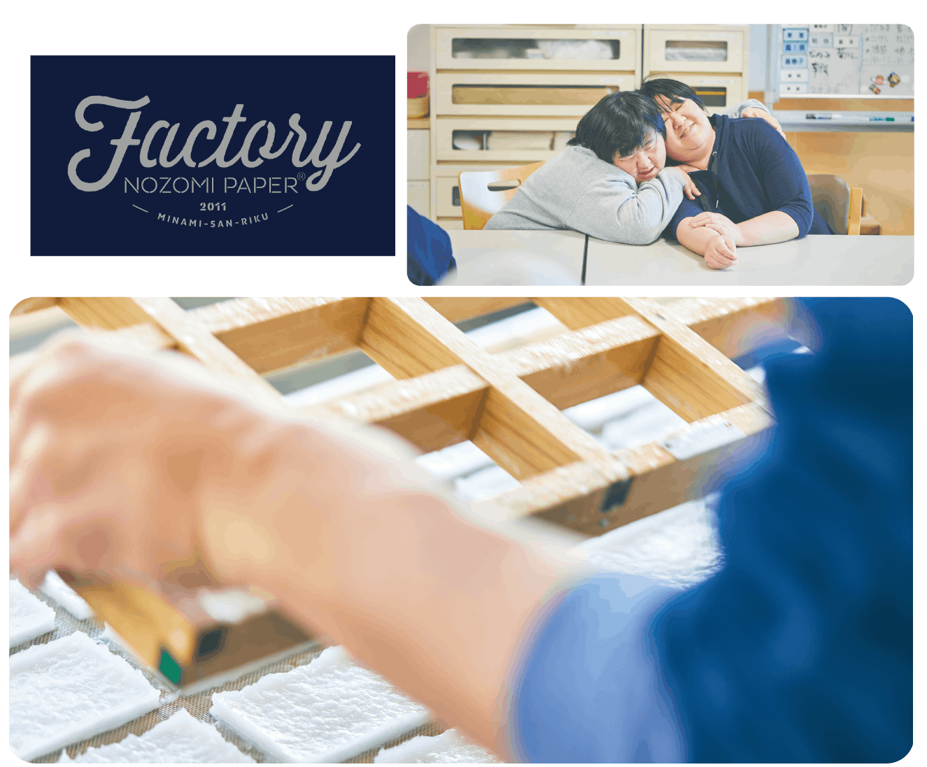 NOZOMI PAPER Factoryは、手漉きの再生紙「NOZOMI PAPER®︎」の生産とアート活動を行う福祉作業所と、デザインユニット「HUMORABO(ユーモラボ)」による、社会と福祉の楽しく新しい関係を探る協働プロジェクト。東日本大震災をきっかけに宮城県南三陸町「のぞみ福祉作業所」で誕生しました。今もつづく支援への感謝の気持ちを商品にかえて、人から人へ、想いを届けるお手伝いができることを楽しみに、 日々、笑顔の中で制作・創作しています。