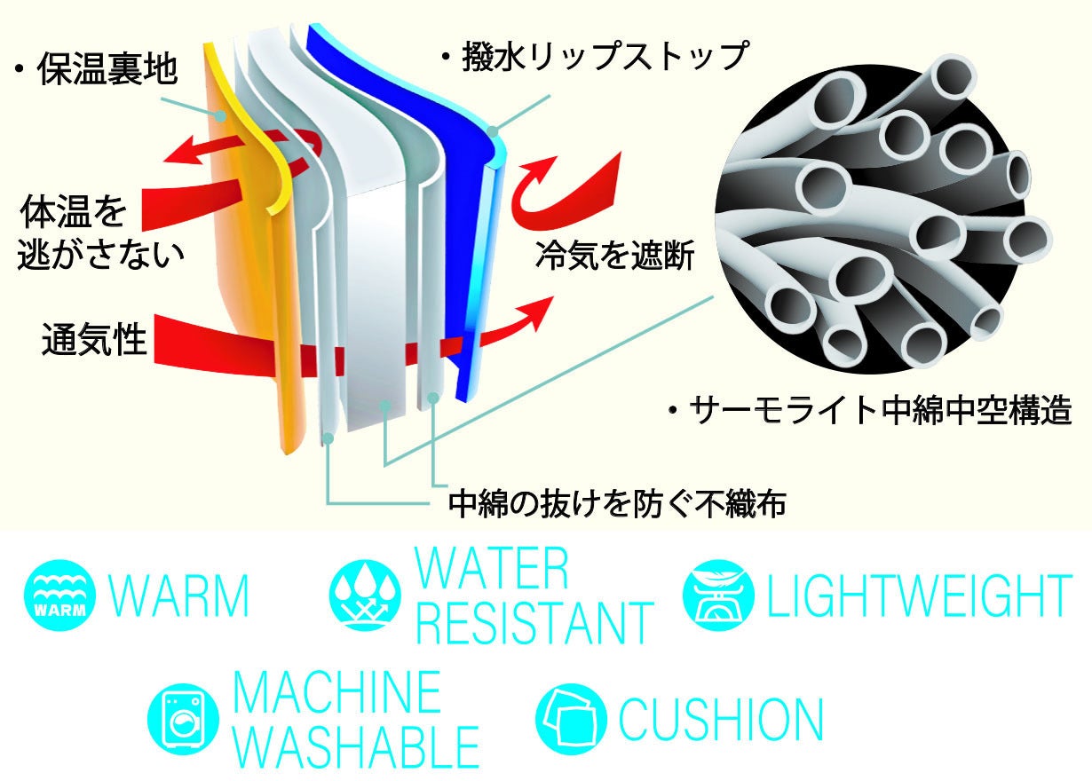 優れた保温性を持つインビスタ社のサーモライト中綿は、機能性が求められるスポーツ・アウトドア分野で数多くのアウターや寝袋を中心に使用されてきました。独自の繊維構造により暖かく快適さを提供する軽量保温素材です。