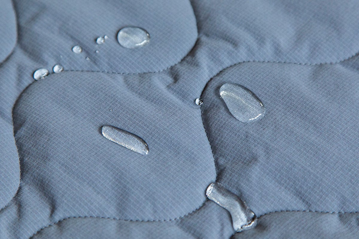 洗濯等による中綿の抜けを防ぐため、スパンボンド不織布で挟んでいます。これにより中綿の飛び出しを防ぎます。