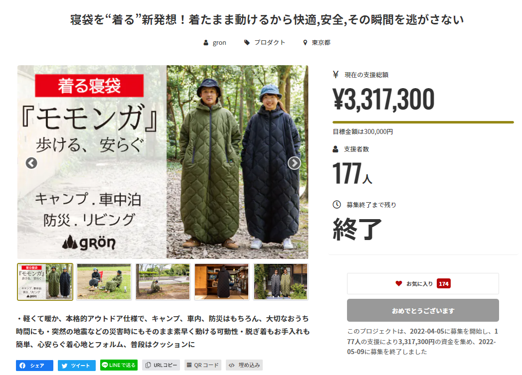 2023/04/25 17:34この度は『【身体の熱で暖をとる】保温力・伸縮性が進化!着てすぐぽっかぽか、自由に動ける寝袋』プロジェクトにご支援いただき誠にありがとうございました。無事に製品の方も上がってきまして、最終検品を済ませながら本日より随時発送に入らせていただいております。今の所のスケジュールとしましては今週末までには発送を終える事ができるかと思います。ご自宅でのご使用が目的の方にはこんな時期にいらないよと思われるかもしれませんが、ゴールデンウィーク期間中のキャンプにも間に合えばというお声もいただいておりましたので、ぜひ間に合えばと思っております。運送業者につきましては「佐川急便」になります。大変申し訳ないのですが、個別での発送連絡はしておりませんので、もし具体的な発送日時が気になる方はお手数ではございますが、こちらまでご連絡いただけますと幸いです。その際は個別にて発送日時や送り状NOのご対応をさせていただきたます。私共もしっかりと検品をさせていただきましたが製品もしっかりと満足の仕上がりとなっておりましたので、みなさまにとってもご満足いただける”モモンガ”をお届けできることを願っております。みなさまへの発送が完了次第改めてご報告させていただきます。到着までもう少々お待ち下さい。 もっと見る