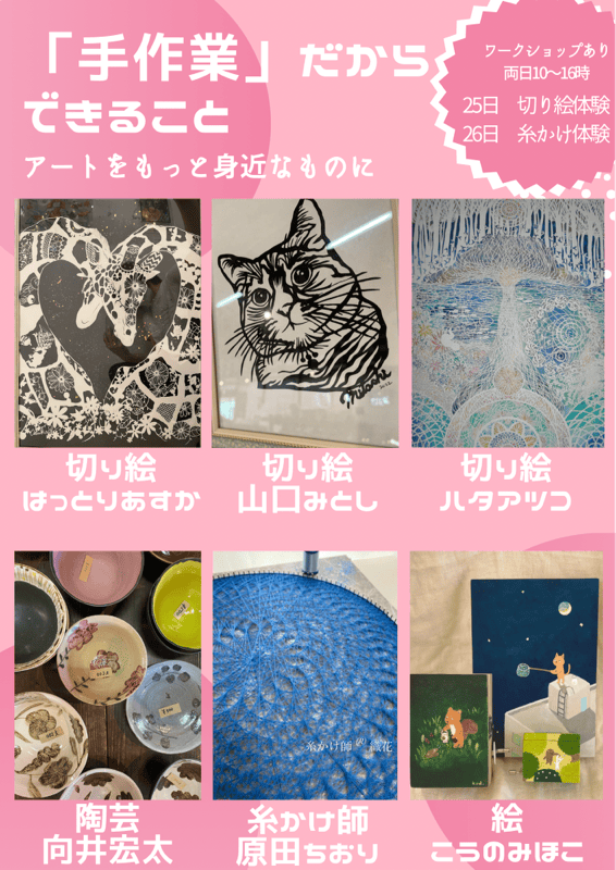 今年の出展作家は6名。切り絵、糸掛けアート、陶芸、イラスト等、私が企画するグループ展ではジャンルを問わず「自己表現が好き」な人が集まります。
