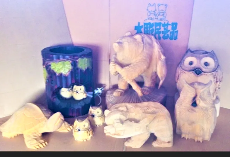 鮭をくわえた木彫りの熊、ウイスキーボトルを抱いた熊、灰皿を持たせた熊、木彫りのふくろう等々いろいろなものを作り、洞爺湖温泉の直売店でも多くの人にお買い求めいただきました。