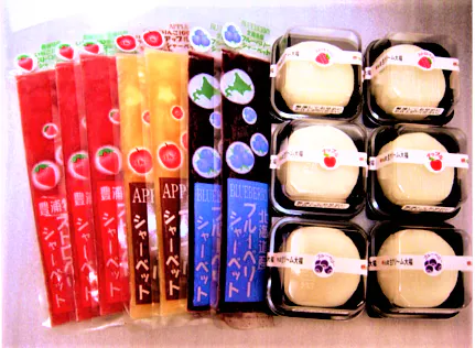 2000年の有珠山噴火で洞爺湖温泉の店舗を閉鎖し、民芸工場の資材置場を利用してイチゴの栽培を始め、いちご狩り・ジャム製品を手掛ける中、砂糖をまぶし冷凍すると長持ちすることから果肉入りのシャーベットを作り始めたました。