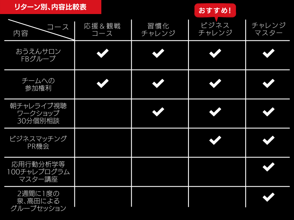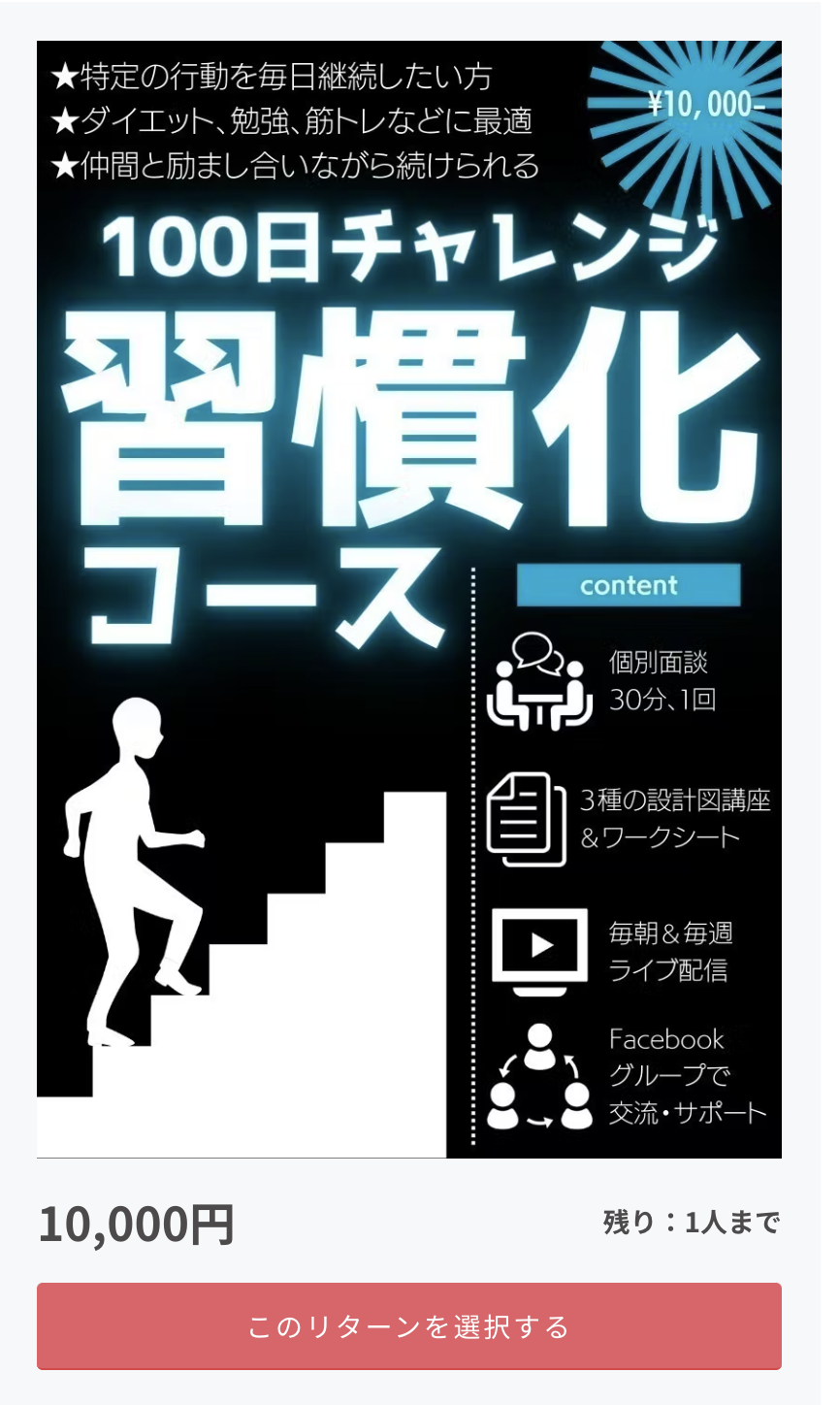 泉、高田どちらかによる個別セッション30分!スタート時や挫折した時、ブーストしたい時など、100日間の好きなタイミングでご活用ください!