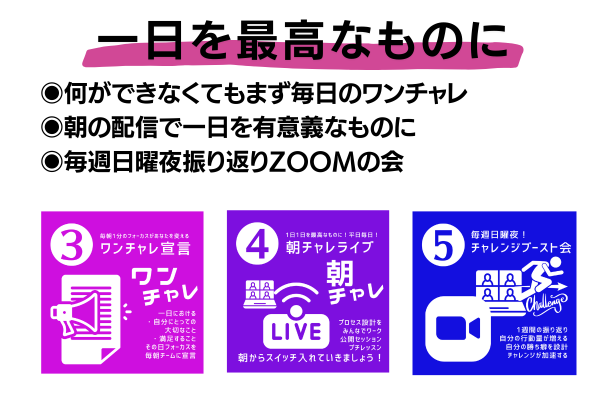 もしあなたが挑戦に行き詰まったり参加できなくなったとしても復活するタイミングがあります。それが復活の儀式。目標の見直しや行動の見直し等、あなたの行動量アップに向けた機会を作ります