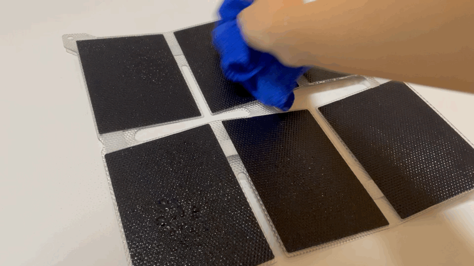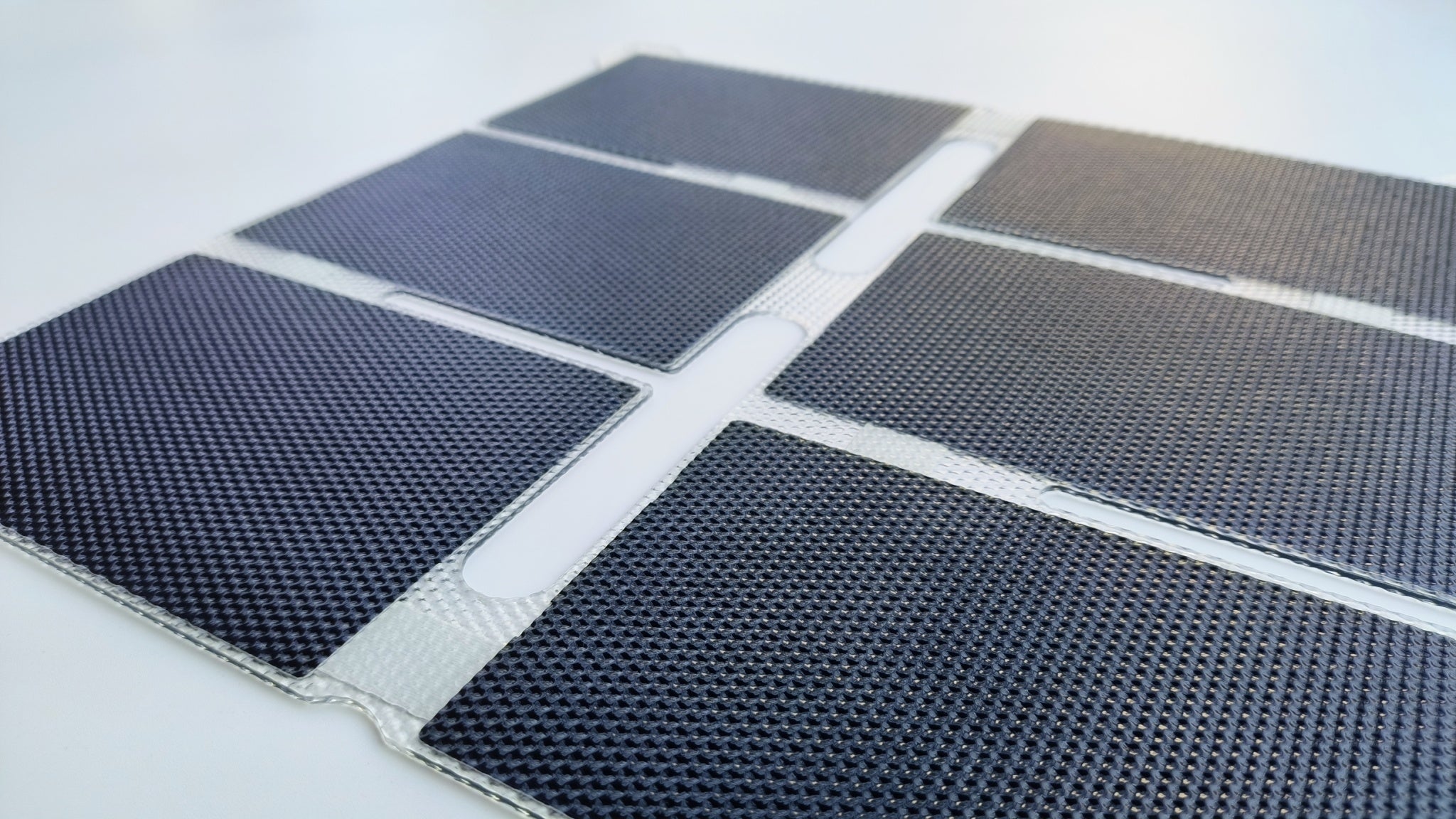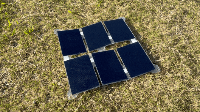 大きい一面のソーラーパネルを切断後、分割された小さいパネルを繰り返しの屈曲に耐える頑丈なフレキシブルフラットケーブル(FFC)で繋げて再構築し、畳んで持ち運べるコンパクト性を実現しました。