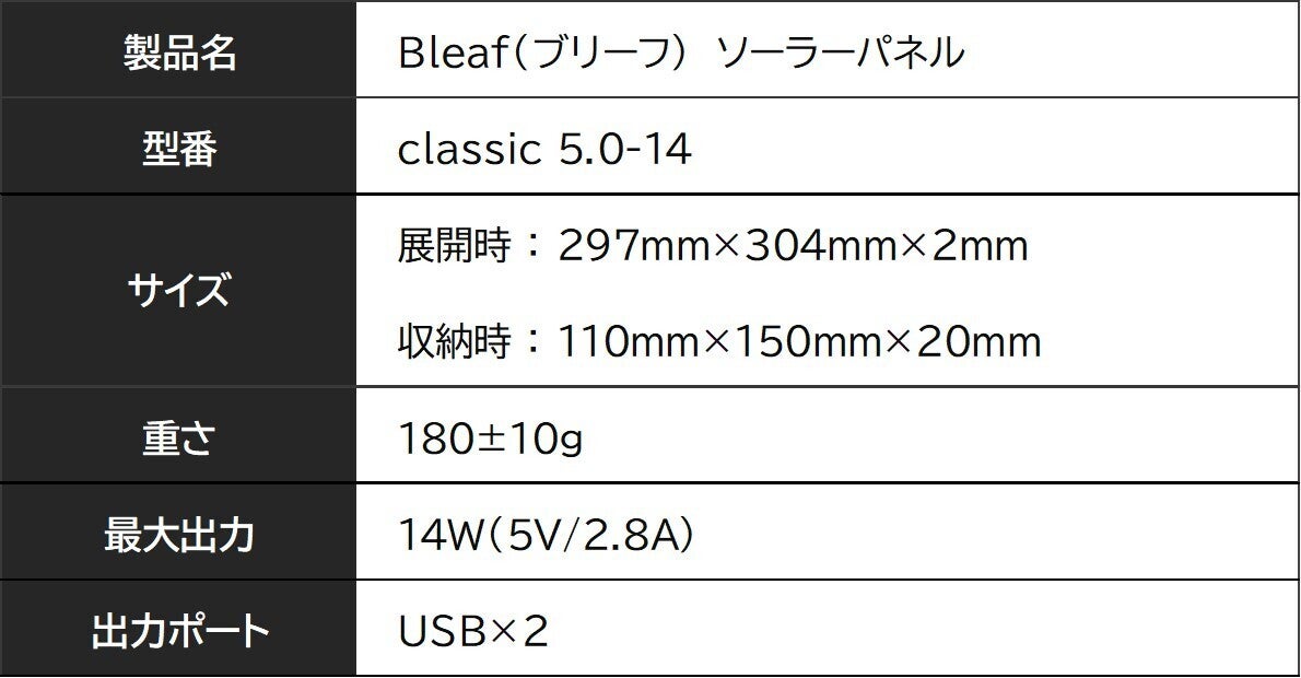 携帯型のソーラーパネルでは最大出力が5W、10Wのものが多いですが、「Bleaf」は最大出力14W!