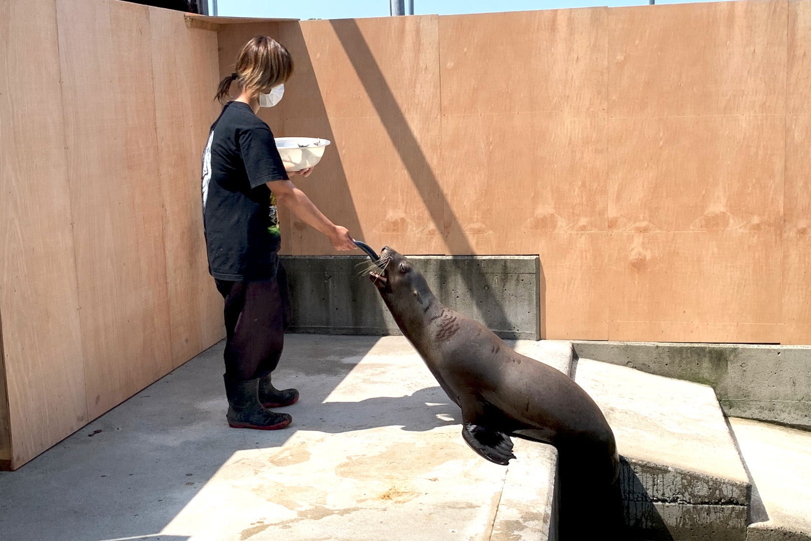 当施設に来た当初は、僕にも牙を剥き襲い掛かってきていましたが、時間をかけながら馴致をすることで現在は僕に牙を剥くことはなくなりました。しかしながらこのニホンザルは誰でも扱えるわけではなく、僕以外がコントールをすることは難しいでしょう。
