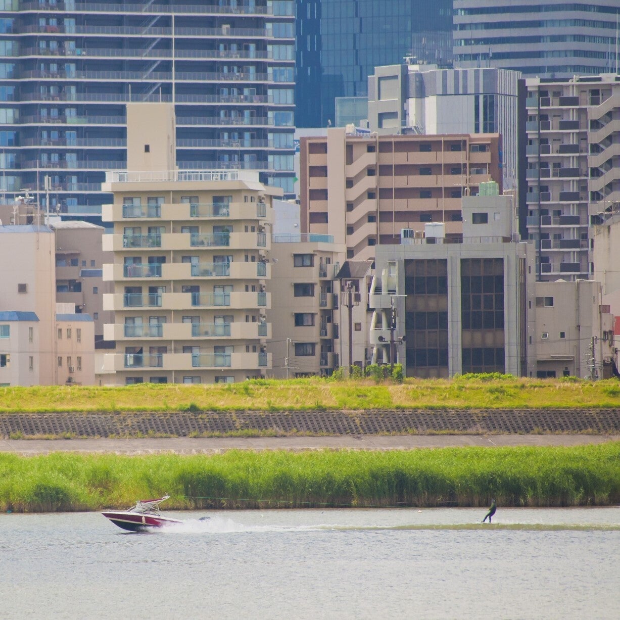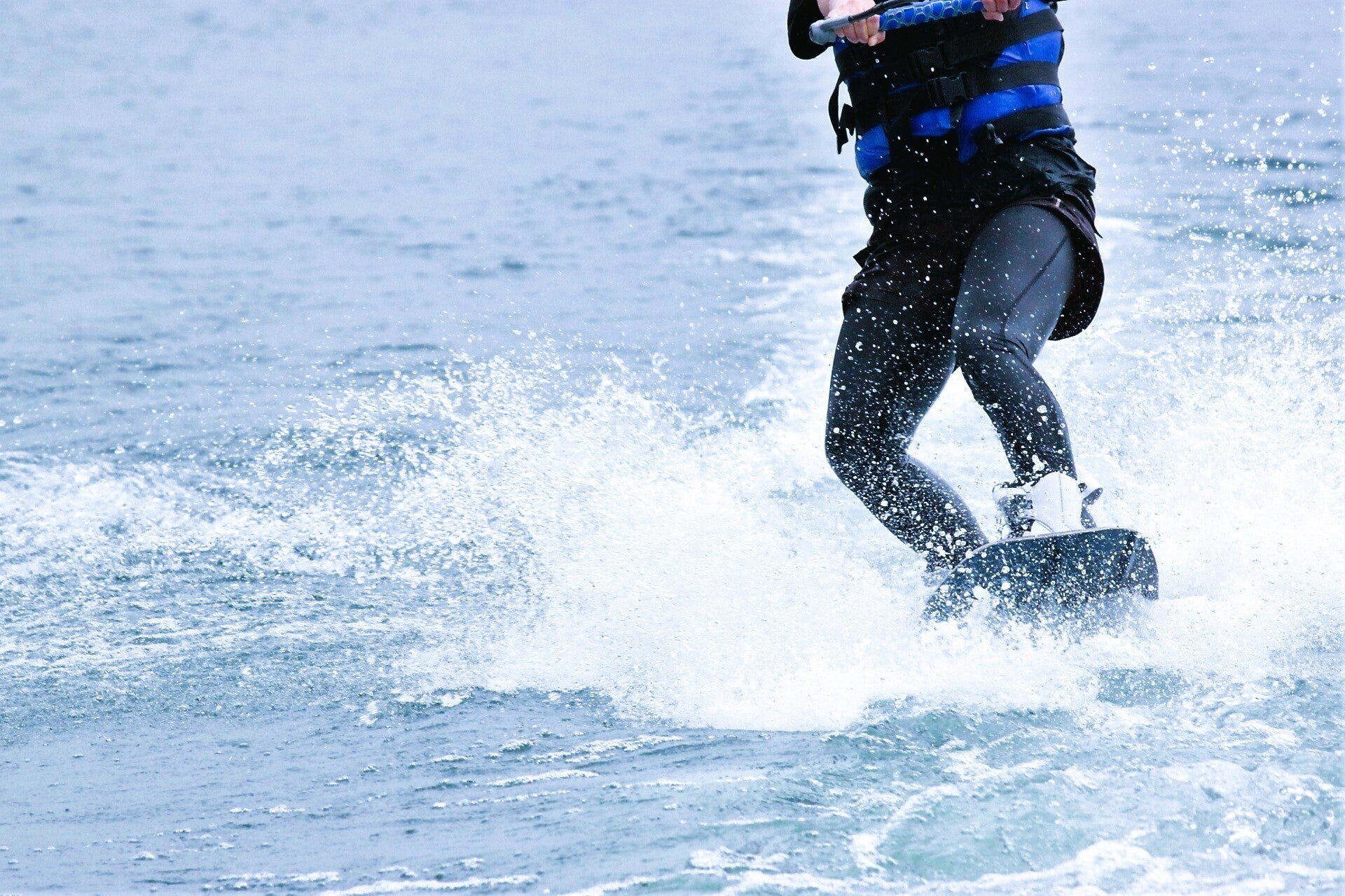 モーターボートや水上バイクなどで持ち手の付いたロープをひっぱり、プレーヤーはその持ち手を握ってひっぱってもらいながら水面を滑るんです。 これが何とも言えない爽快感!