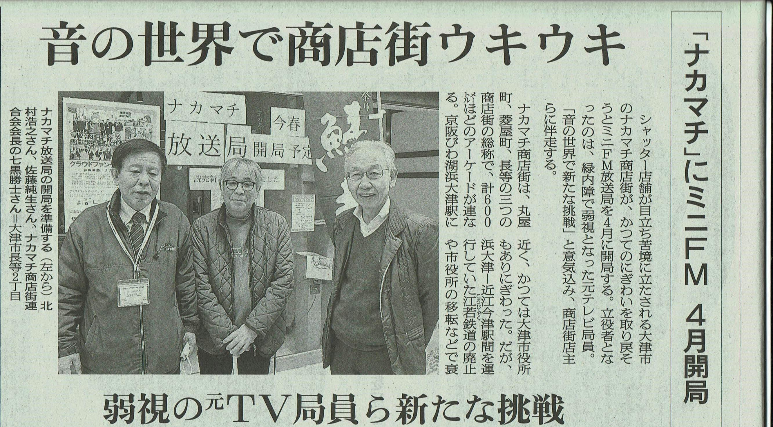 ナカマチ商店街を中心とするごくごく限られたエリアに特化した番組をお届けしていきます。毎日午後3時のラジオ体操はもちろんのこと、大津祭のお囃子や「今、○○○でセール開催中です!」「迷い猫、迷い犬を探しています!」などの地域住民の皆様の身近な話題をお届けします。また、行政機関と連携し、防災や防犯、市政情報などもわかりやすくお伝えします。