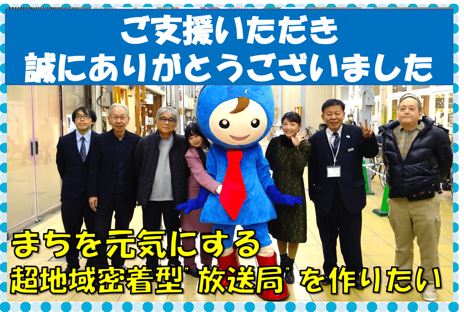 日頃よりナカマチ商店街連合会の活動に御理解と御支援を賜り、厚く御礼申し上げます。このプロジェクトは、放送局をベースに地域の様々な人々を巻き込み、地域の活性化と社会課題の解決を目指す前例のない事業であり、専門家を有する団体(一般社団法人あかるいまちづくりの会)を中心に、大学等教育機関・各行政機関の皆様のお力添えをいただいているところでございますが、金銭的な部分であと一歩の支援を必要としています。