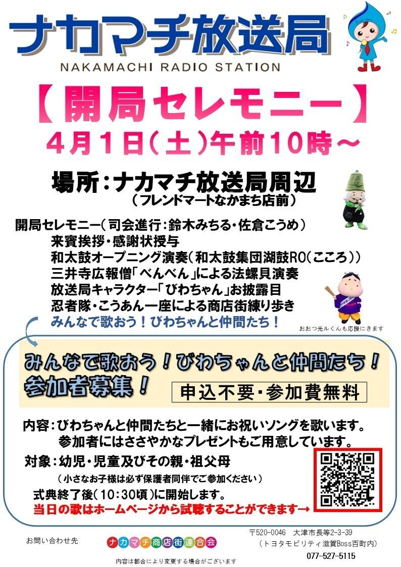 ナカマチ商店街周辺の長等・中央・逢坂小学校の子供達がパーソナリティーとなり、様々なコンテンツを放送。地域の人との交流も交え、こどもの発表会の場をラジオで提供。