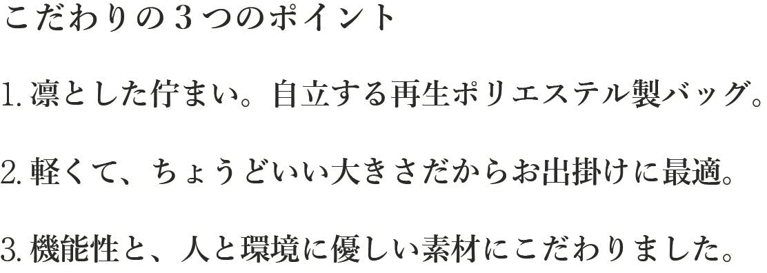 今回新たに開発したバッグでは、繊維製品で培った「素材の特性や魅力を引き出すものづくり」を活かし、薄手の再生ポリエステルのしなやかさ、軽さに注目。熟練の鞄職人の方と何度も試作を繰り返して、日常の使いづらいを解決するおしゃれなバッグが完成しました。丹精を込めたこのバッグが皆様の「こういうのが欲しかった!」と思っていただけるバッグになれれば幸いです。