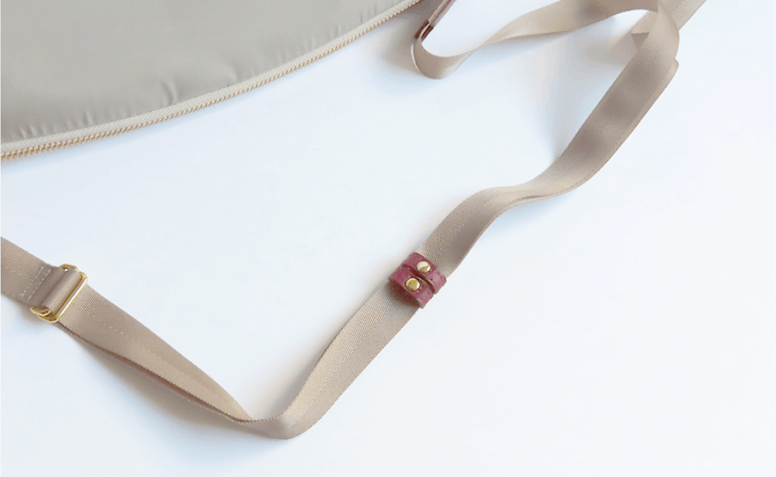 通常のものよりも薄いショルダーベルトは上品さも演出し、上着の中にかけてもごわごわしません。調整金具はWカン仕様になっていて、調整が簡単にできて、薄くてもしっかり止まります。