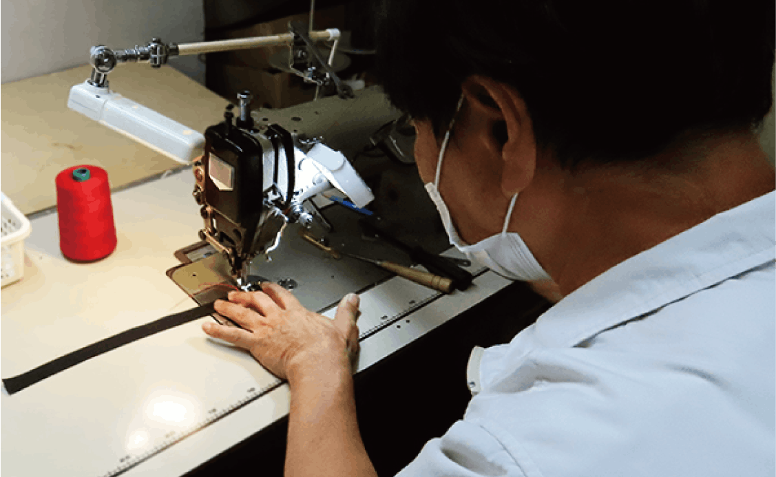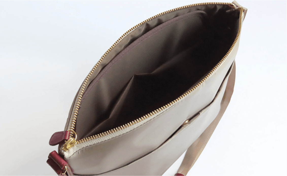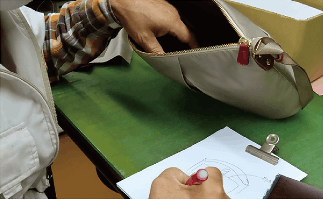 弊社のある東大阪は、「ものづくりの街」として有名で、熟練の鞄職人の方とタッグを組み製作していくことができました。協力してくださった工場様は、縫製OEM の製品の製作やサンプルの製作が得意で、学校で使われるような裁縫バッグや、お習字のバッグ等を製作していらっしゃっており、しっかりとした構造のバッグを作ることに定評があります。ポリエステル製のバッグで、どうすれば自立して使いやすいバッグになるのか、プリーツを綺麗に出すにはどうすればいいのか等を熟練の職人さんと試行錯誤しながら解決策を模索していきました。最終的には、機能性もデザイン性も兼ね備えた理想のバッグを作ることができました。
