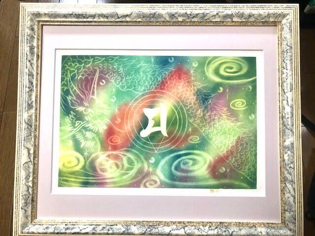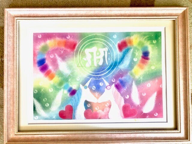 "Yoko-san's art is filled with magical colors, Sanskrit high vibrational codings, and the energy of divine love. My painting from Yoko-san radiates a blessing for creating good relationships, and I love to see it everyday. I feel the two dragons in my painting are continuing to teach me about my future. Thank you very much Yoko-san for creating such a high-energy master piece!" - Doni Amoris