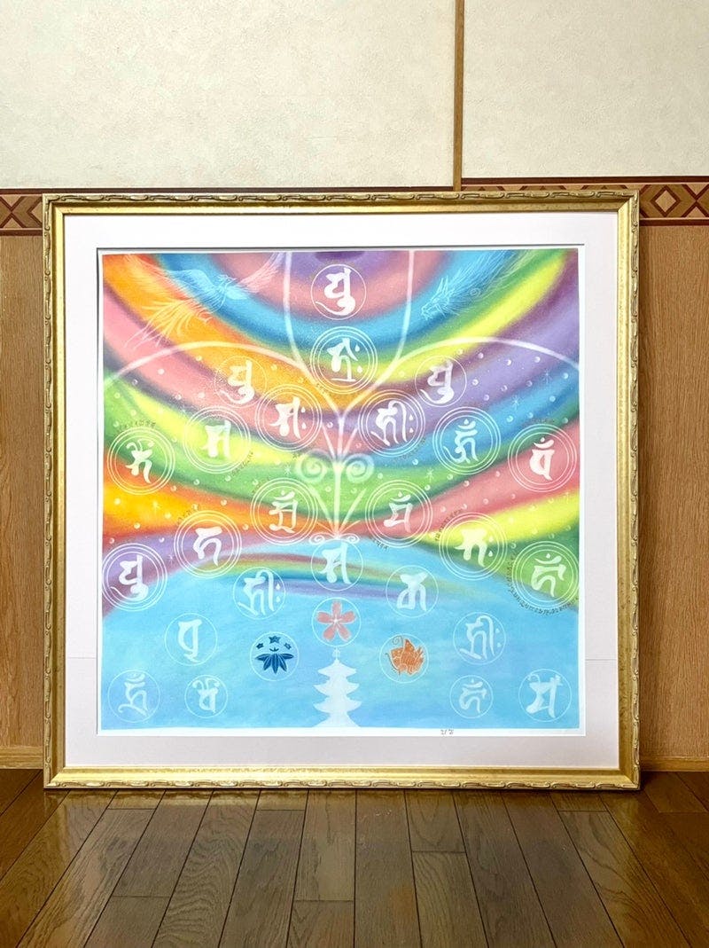 特に「虹色の弥勒の世界の扉が開く」のお作品は、鑑賞する方すべての心に平和への想いを起こさせる素晴らしい梵字アートのお作品としてお声をいただいております。