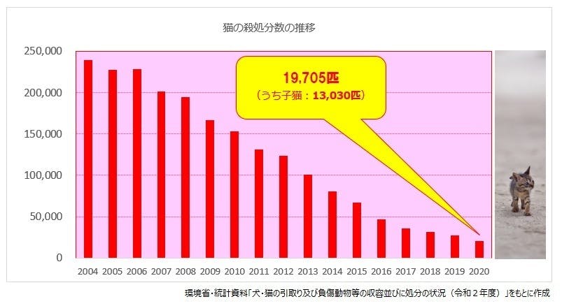 今日、保護猫活動が全国に拡大し、猫の殺処分数は年々減少していますが、現在もなお年間約2万匹の猫が殺処分されており、このうち13,030匹(66%)が離乳していない子猫です(令和2年度・環境省自然環境局の統計資料 )。