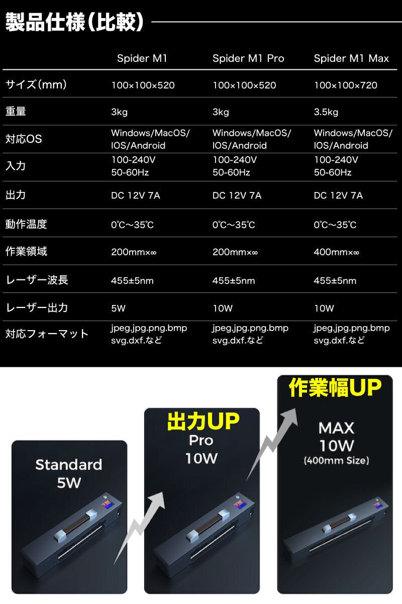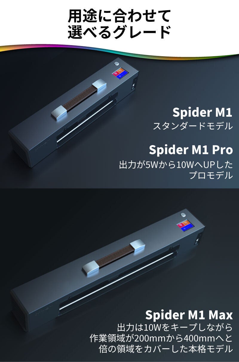 A:Spider M1 Standard/Spider M1 Pro は 200mm (幅) * 無制限の彫刻が可能、Spider M1 Max は 400mm (幅) * 無制限の彫刻が可能