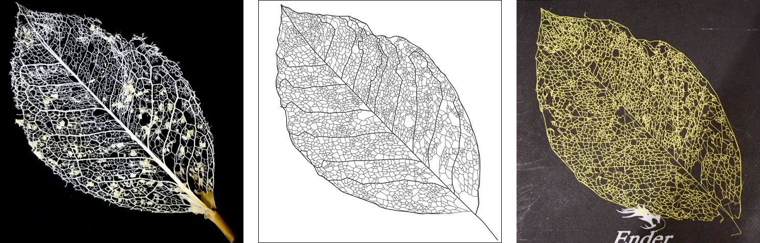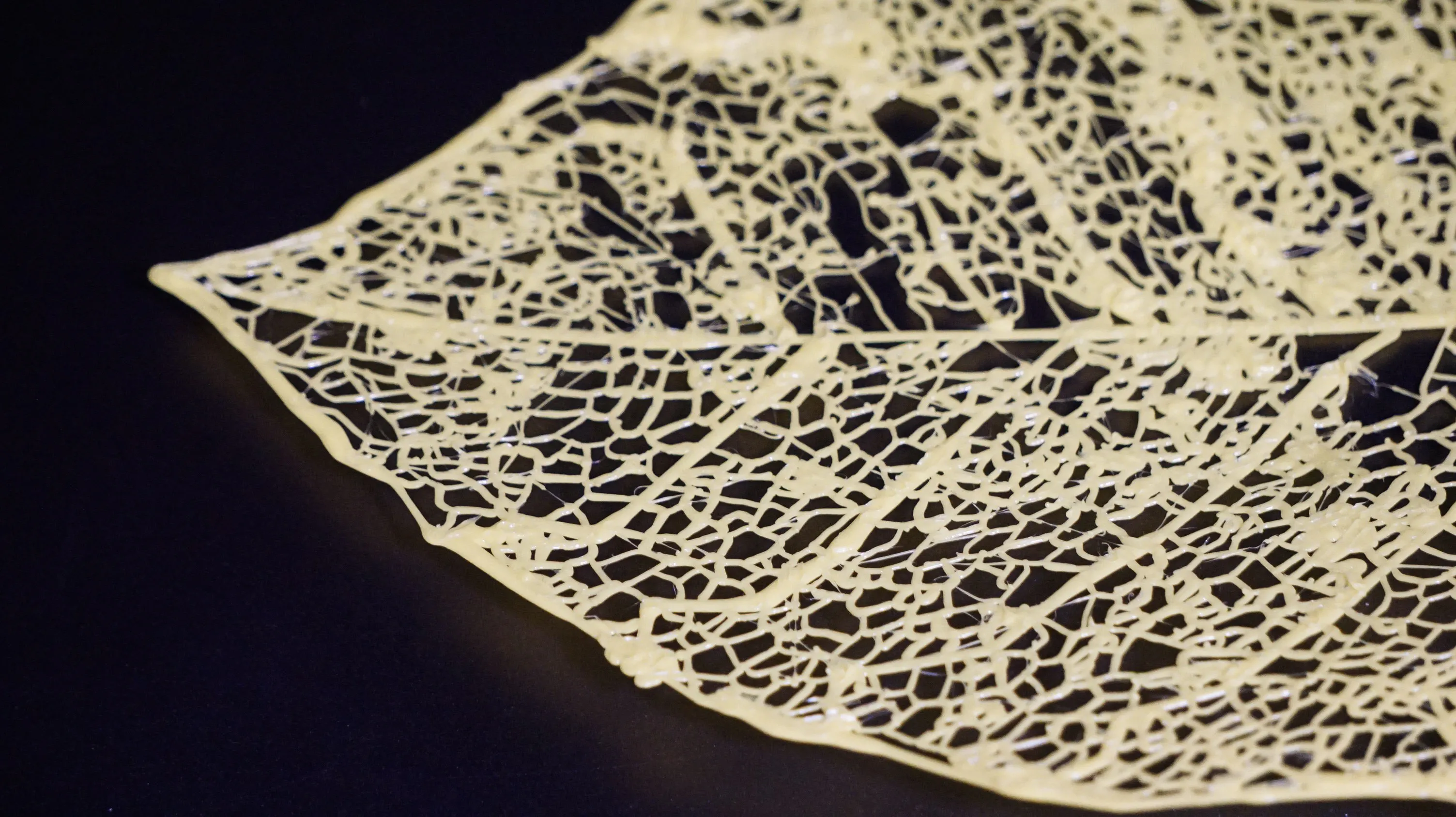 そうして行き着いたのが、自生する植物の葉脈を転写(トレース)して3Dプリントする表現技法の開発です。葉っぱから葉脈部分だけを抽出し、手書きでなぞることでデータ化する、という地道な手法ですが、コンピュータによって葉脈を自動生成させるのとは異なり、虫食いの跡やわずかな歪さまでも再現することができ、リアルな表現を実現することができるようになりました。