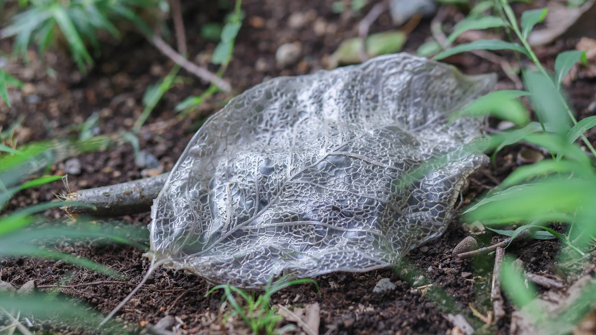 葉が記は、本物の葉っぱの葉脈をデータ化し、生分解性のプラスチック*で3Dプリントしたものに、DIYバイオプラスチックと呼ばれる寒天をベースにした素材を組み合わせてつくられています。