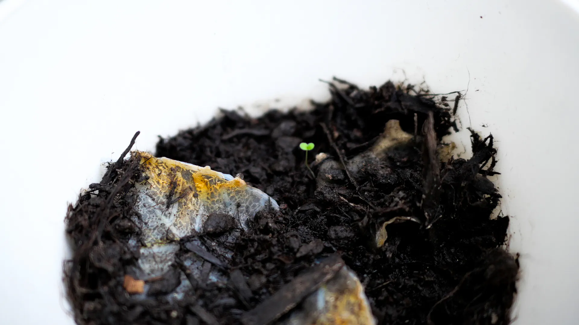 葉が記に含まれている種は、水分と土中の微生物による分解の過程で土に飛び出し、やがて新たな生命として芽を出します。