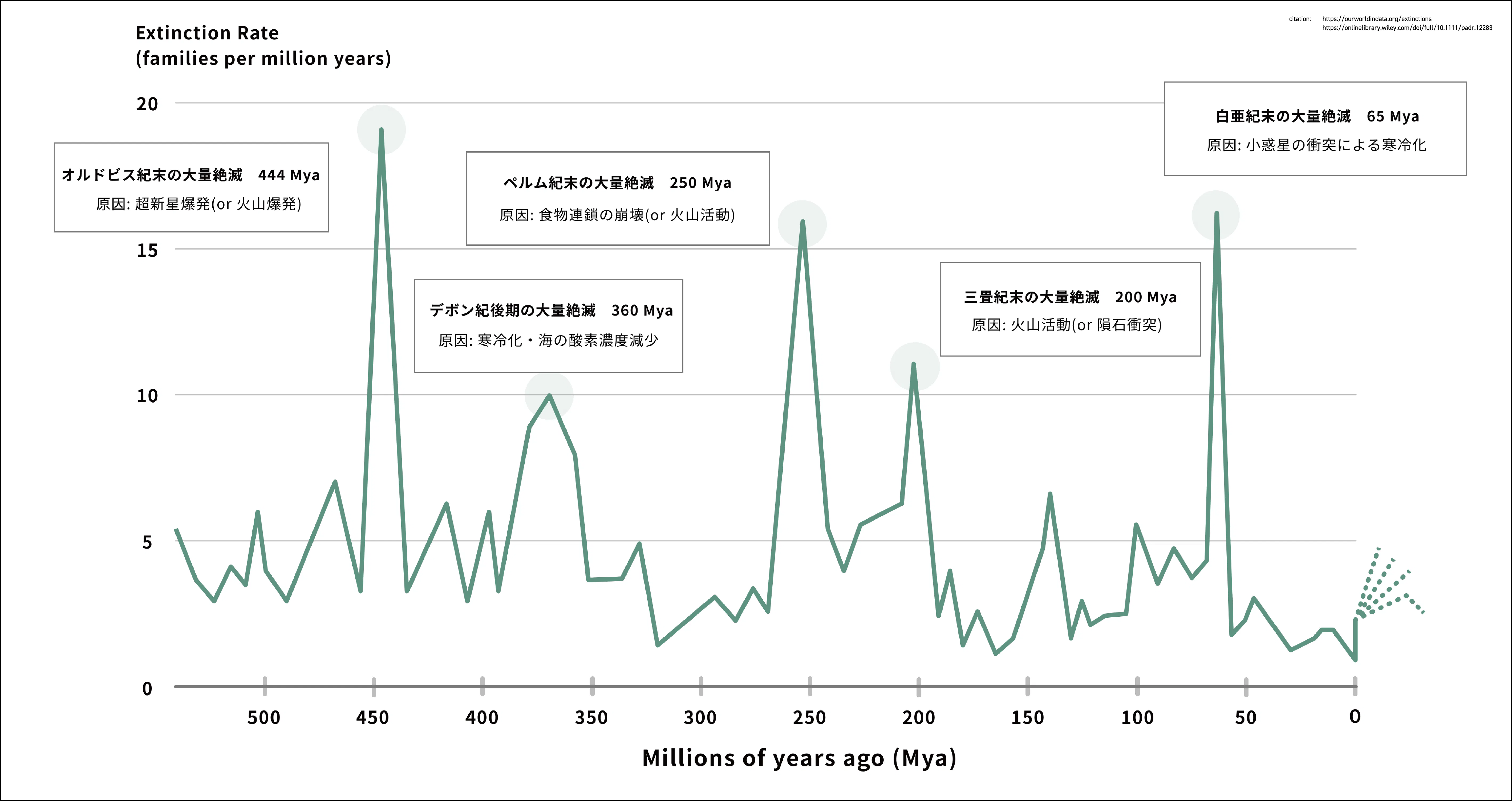 このグラフは、陸上植物が誕生した約5億年前から、5回に渡り発生した大絶滅(Big Five)を表すものです。 人類の誕生よりも遥か前から存在する植物が、数多くの試練を乗り越え、今につながっていることがわかります。