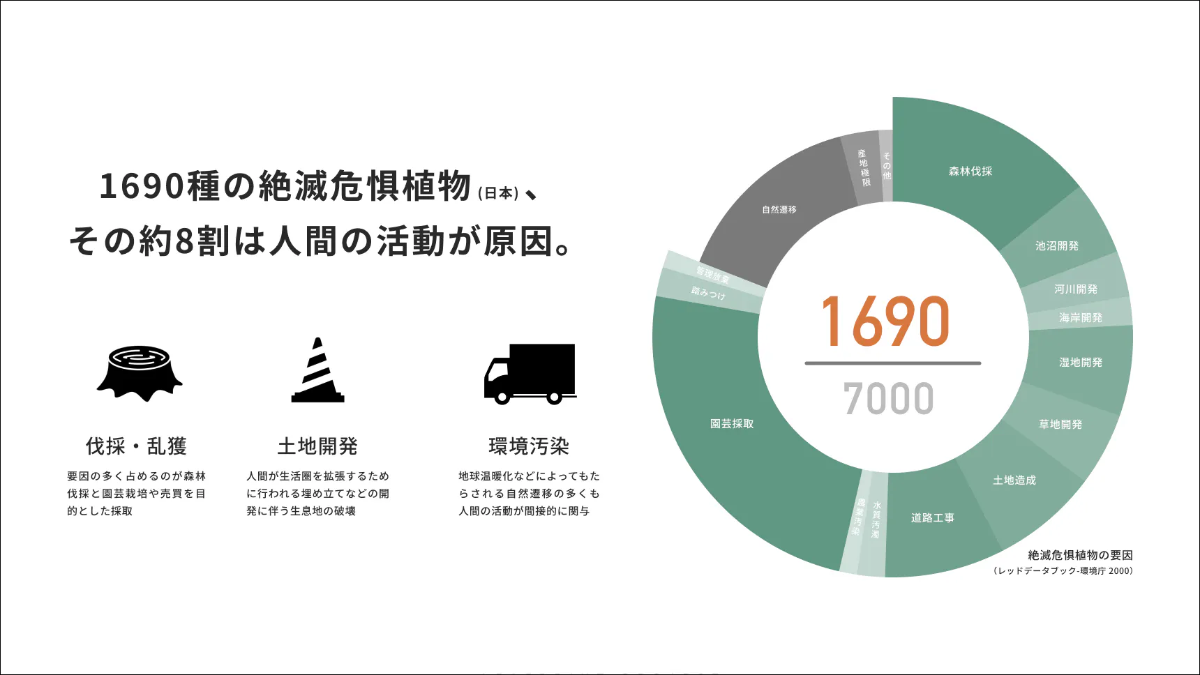 隕石の落下や超巨大地震など、地球環境が起因して起きた5回の大絶滅とは異なり、今現在、絶滅の危機に瀕している植物の原因は約8割が人間の活動によるもの。