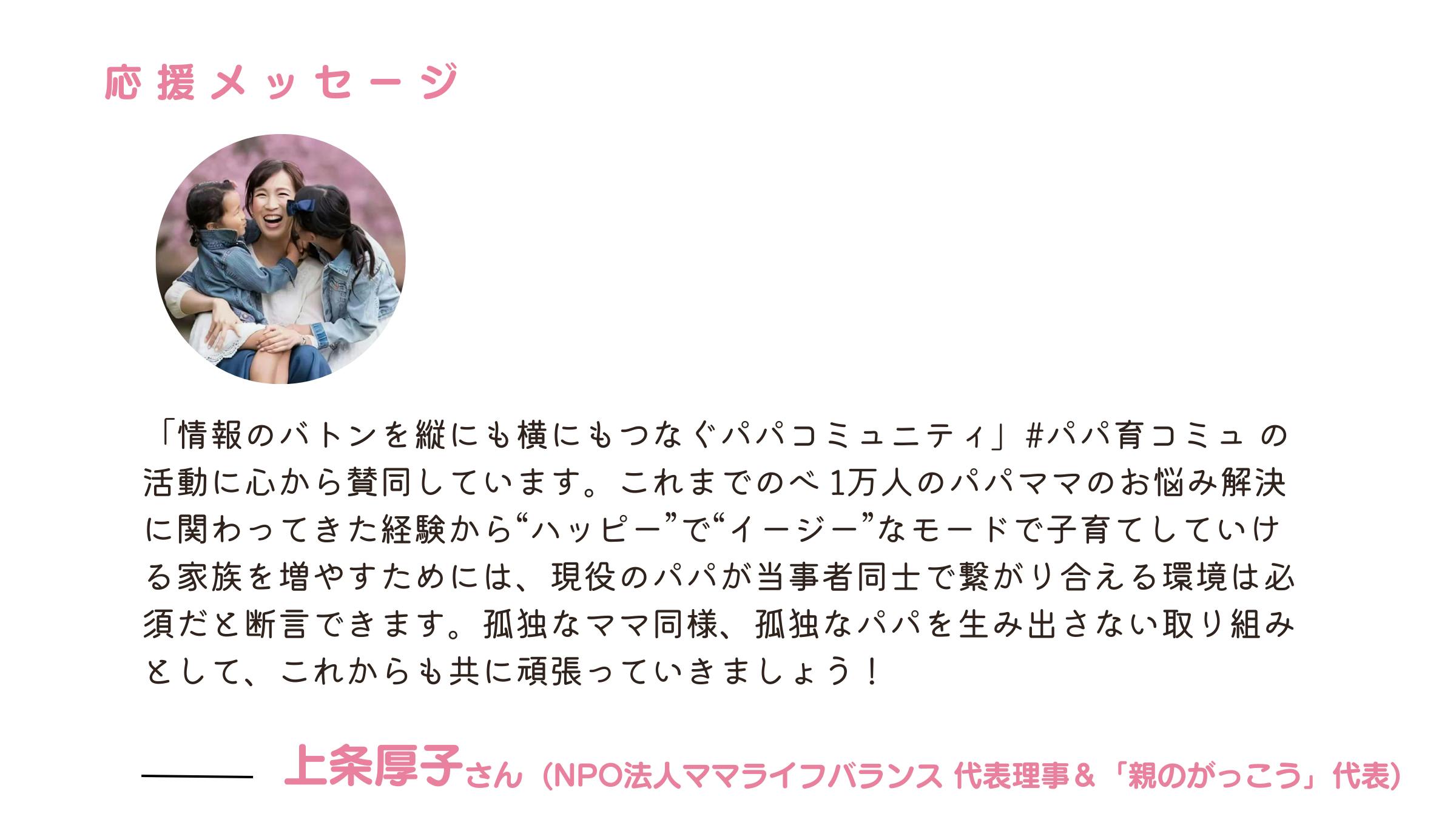 「親のがっこう」の代表の 上条様 (@atsuko_achan) より応援メッセージを頂戴しました!
