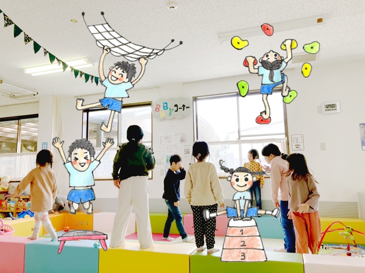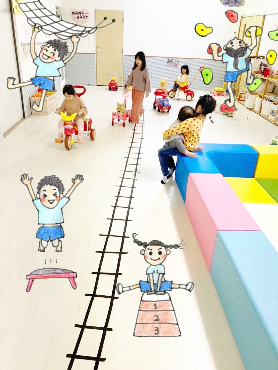設置する室内遊具は、イラストのようなものをイメージしています。組み立て次第で何通りもの遊び方ができる巧技台、ボルダリング、平均台などです。