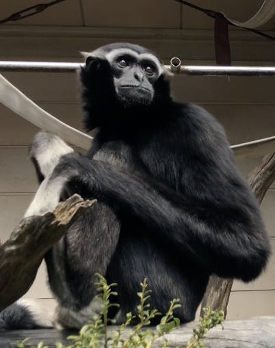キボンハウスには、ボウシテナガザルのカン・カナコ・トリックの3頭が暮らしています。