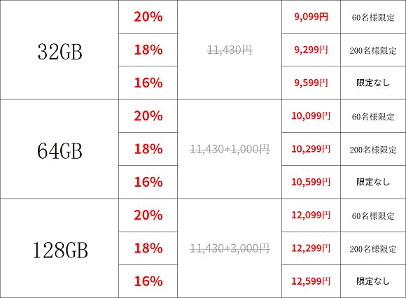 ※64GBの価格は32GBから1,000円、128GBの価格は32GBから3,000円プラスになります。