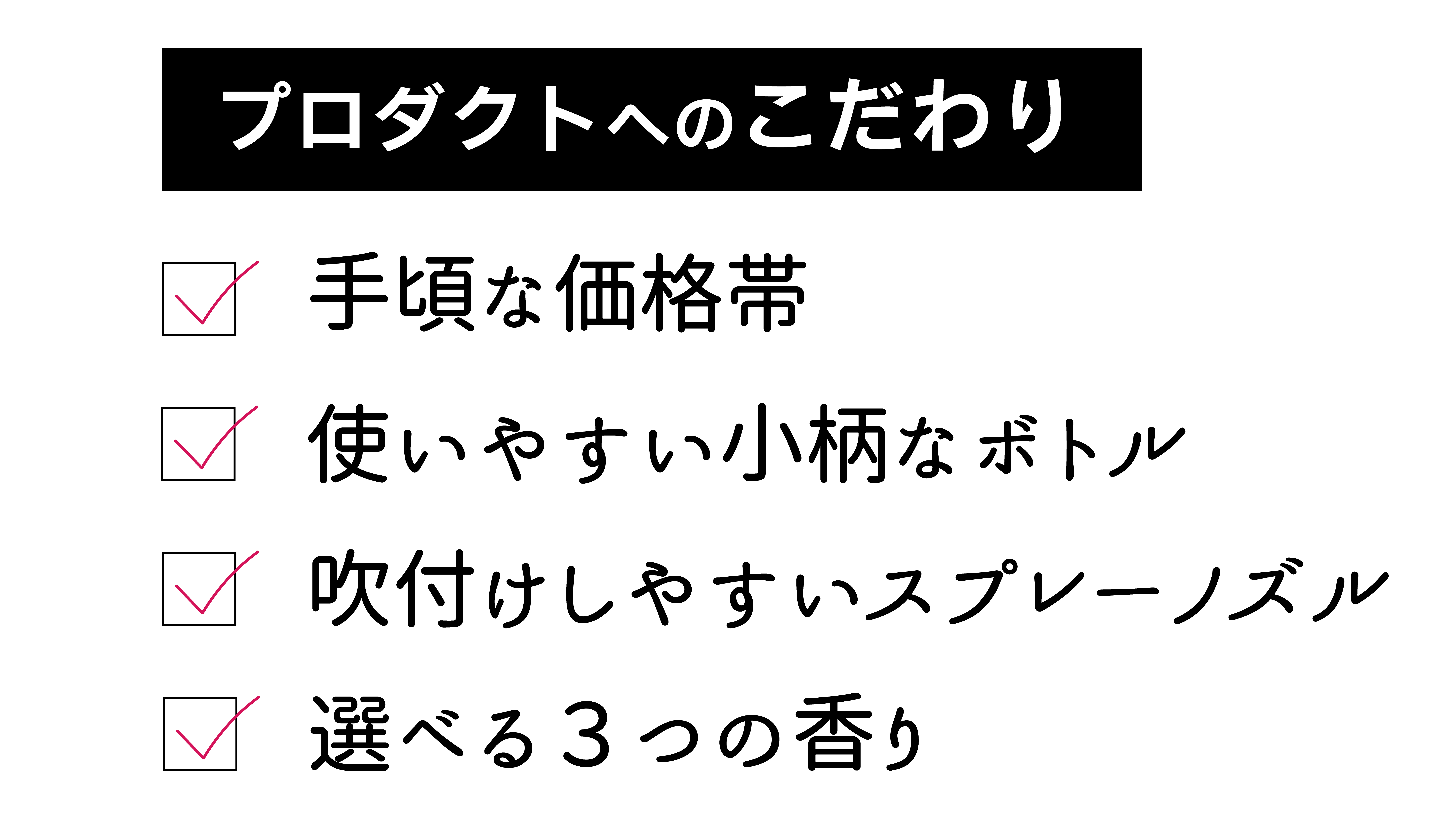 また、この開発には、長年香りの製品製造を行う国内の化粧品工場の協力をいただき、こだわり抜いた香りをお求めやすい価格に、また使いやすいボトル、吹付けに最適なスプレーにする事ができました。