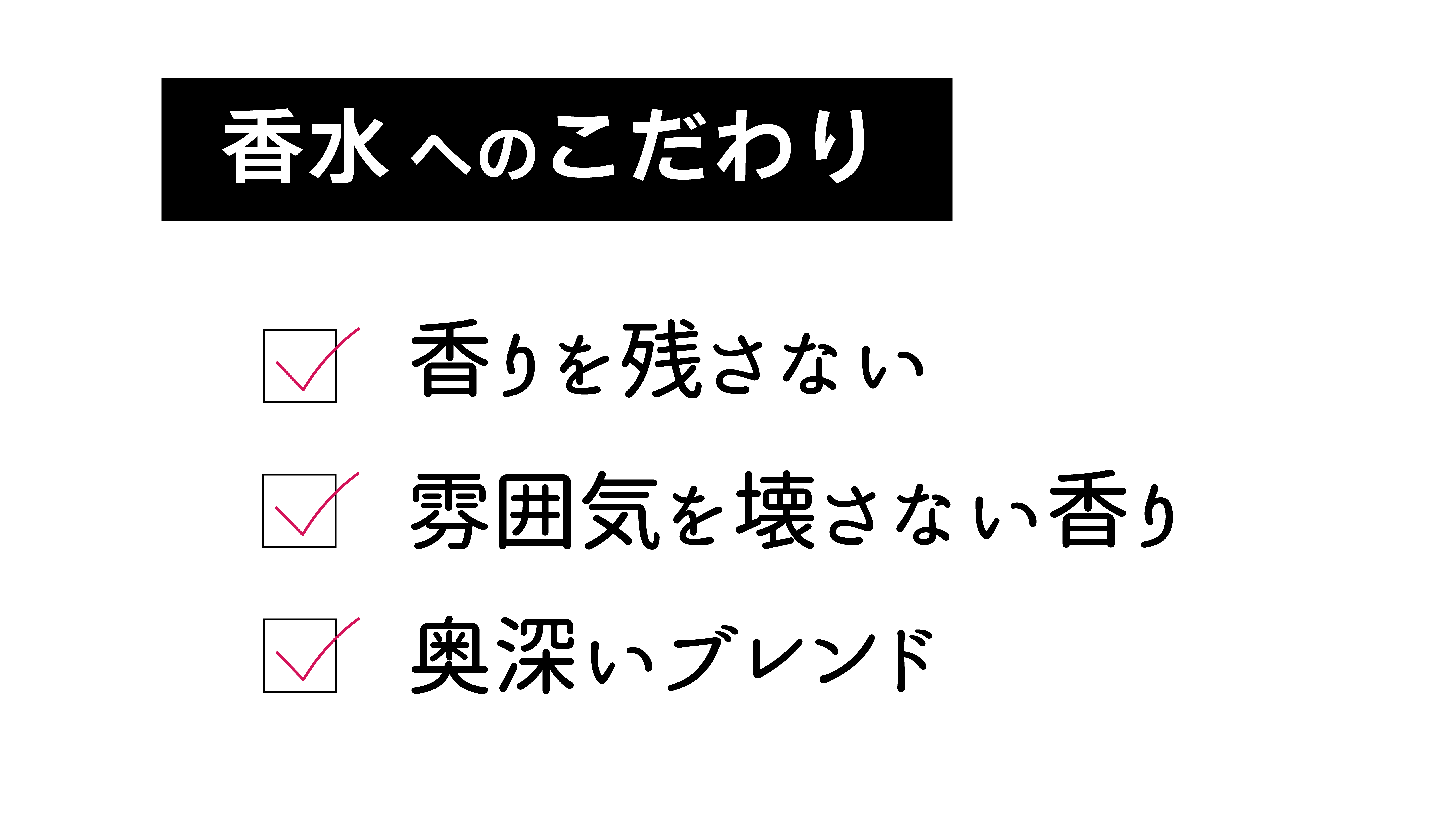 香りの種類:フルーティ(カシス系)ローズ、ウッディ(ヒノキ系)の3種