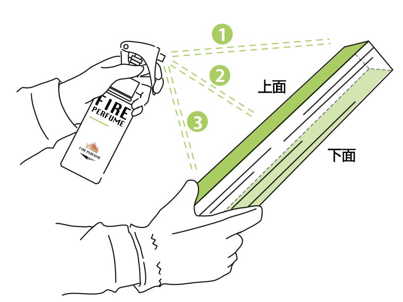 まずは焚き火に使用する薪に「焚き火の香水」を吹き付けます。吹き付ける場所は薪の(長い方)上面と下面の2面。イラストのように片面3プッシュ程度に分けて吹き付けてください。