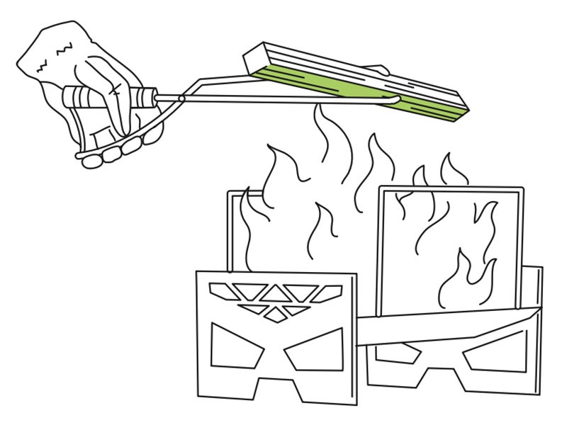 02 いずれかの吹付け面を下にして焚き火に入れる